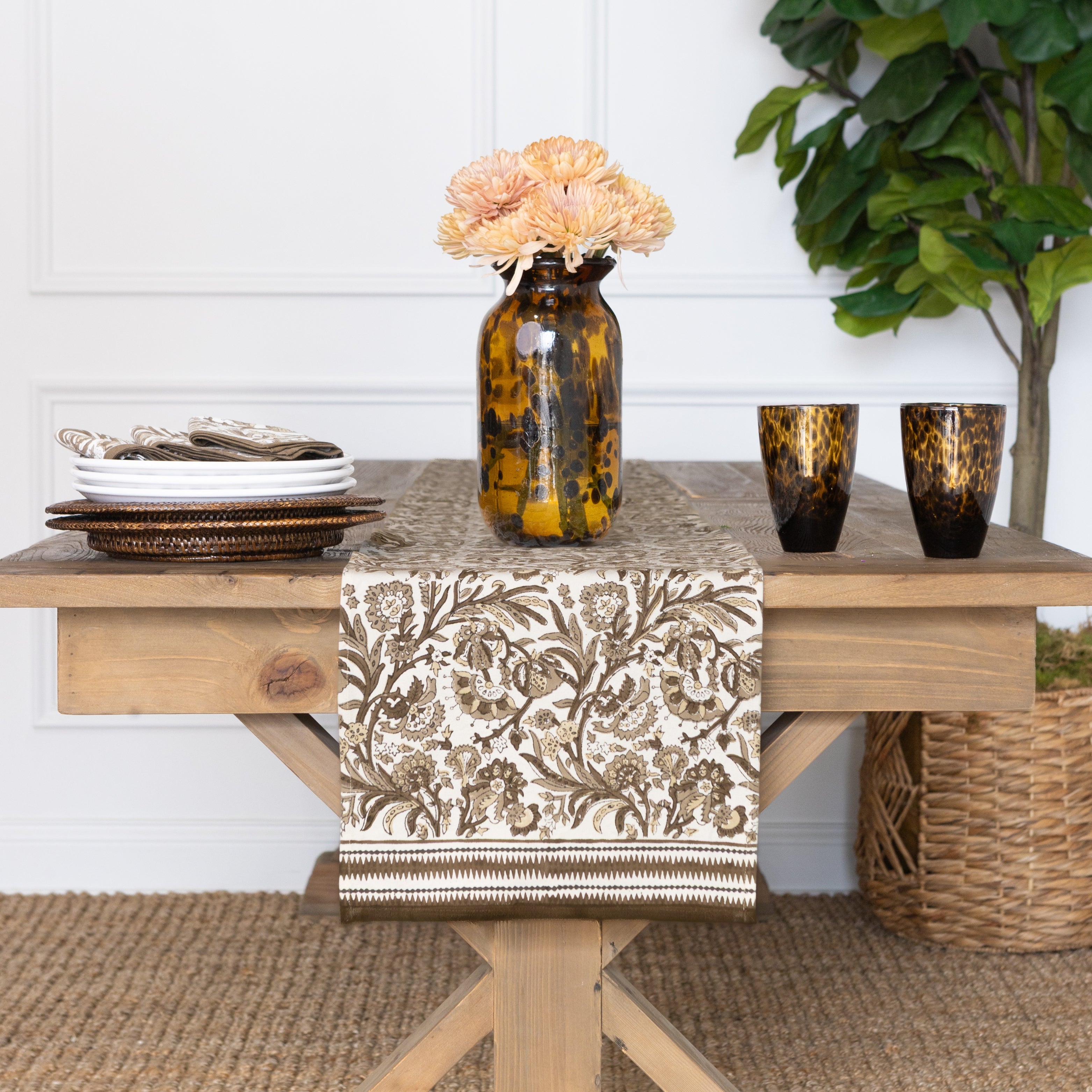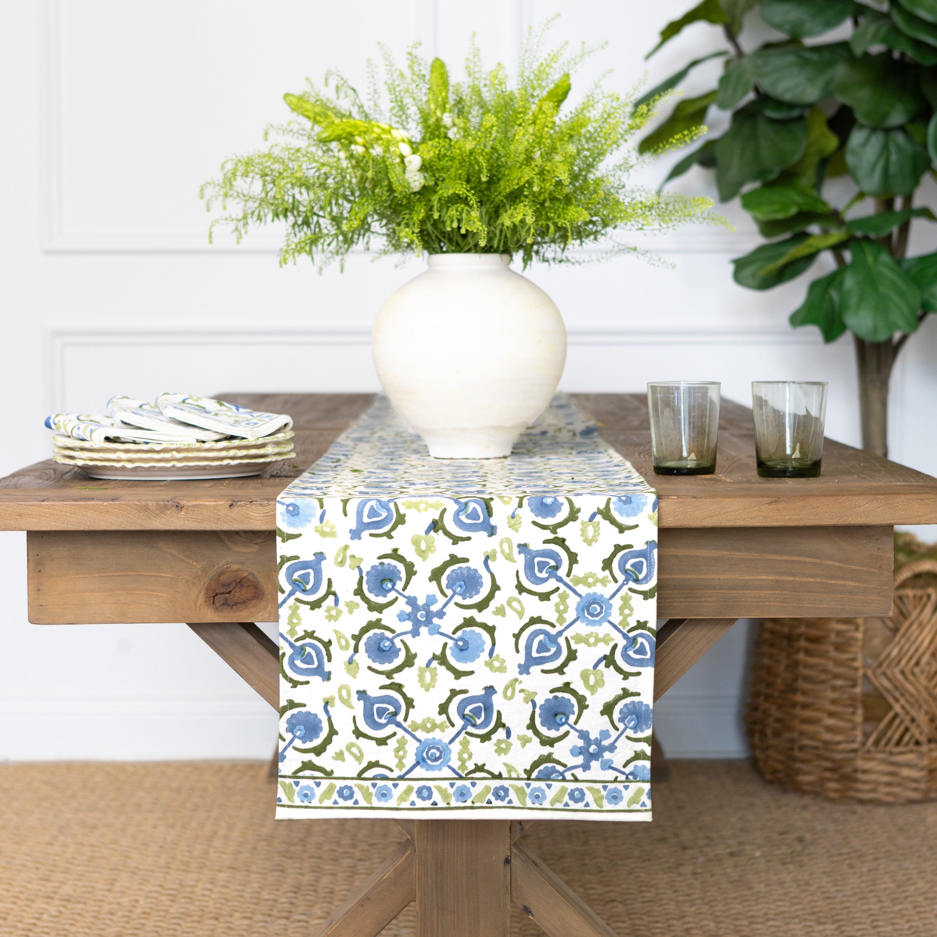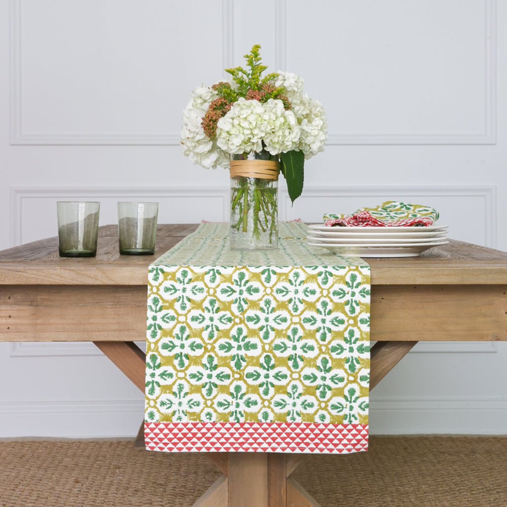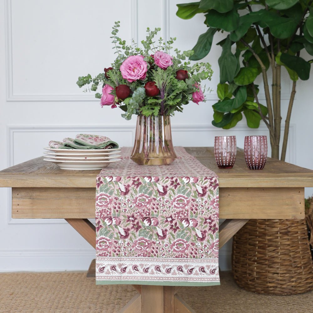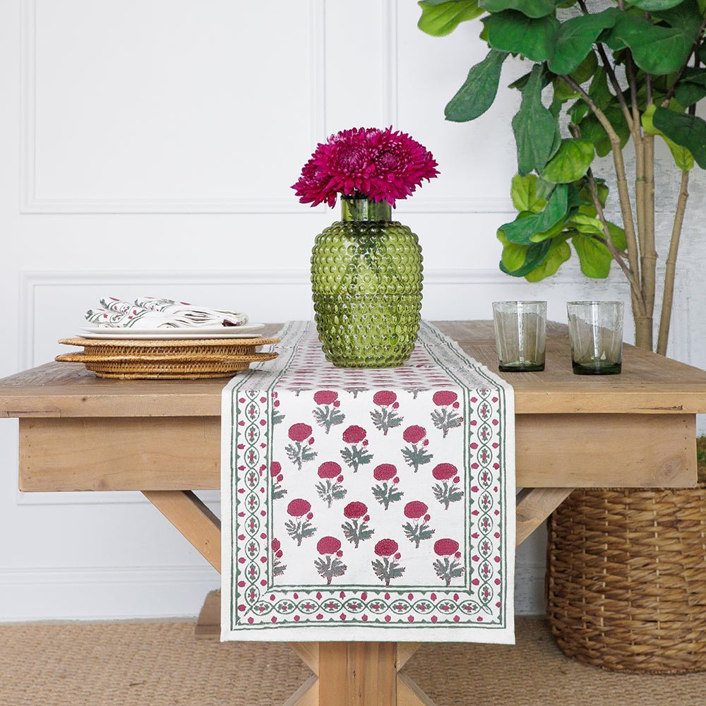 Pomegranate table runners bring a fresh pop of color and pattern to any dining table. Hand block-printed on 100% cotton with vibrant floral and geometric designs, our runners are the easiest way to refresh your decor and instantly change the look and feel of a room. Perfect for layering with matching tablecloths or napkins, each runner is artisan-crafted to add warmth, style, and personality to your tablescape—whether for everyday dining or special occasions.