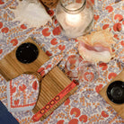 Introducing a beautiful new print that is predicted to be a best seller year round! This floral print showcases periwinkle vines and warm orange blooms with earthy undertones. Perfect for day or night and all seasons, it is sure to bring a colorful but calming energy to your dining experience.