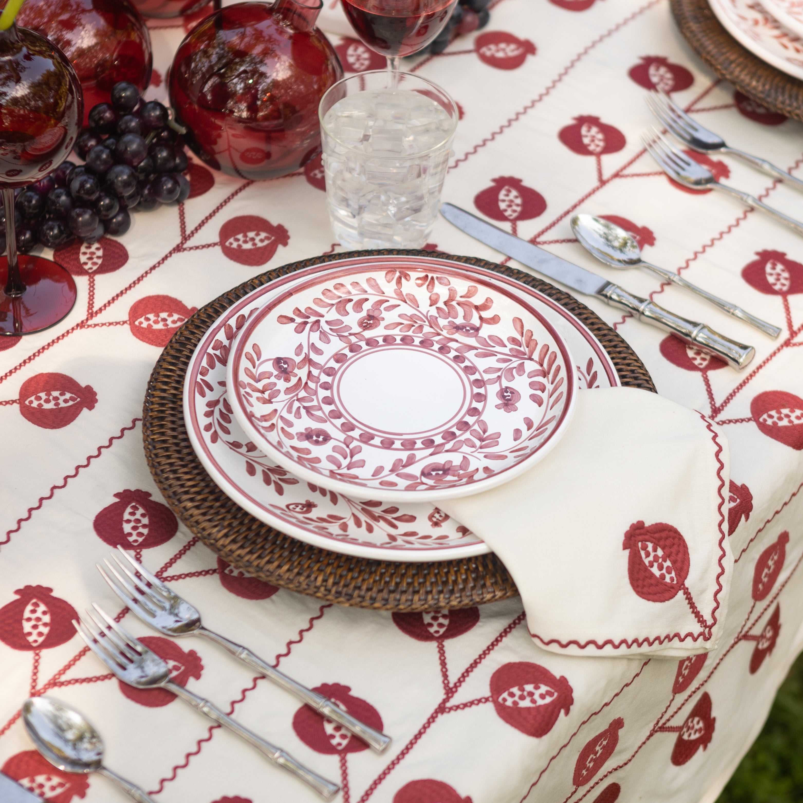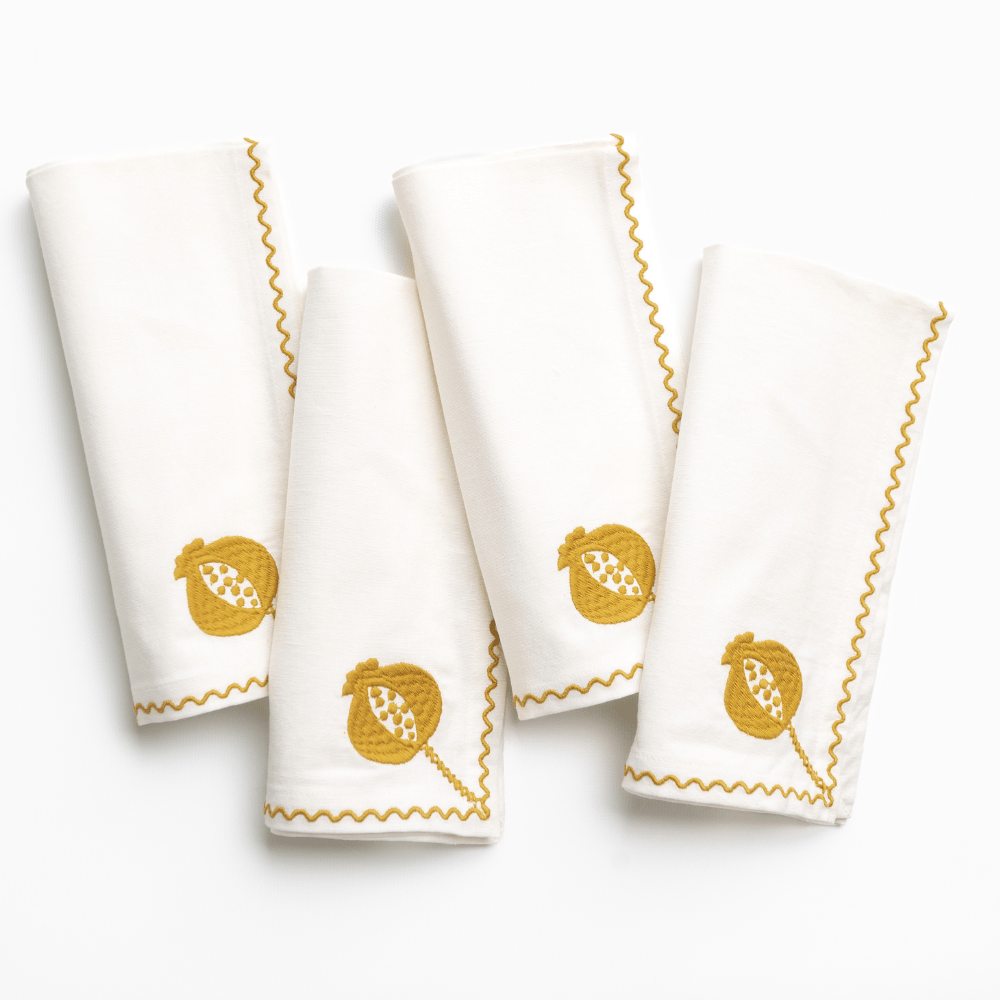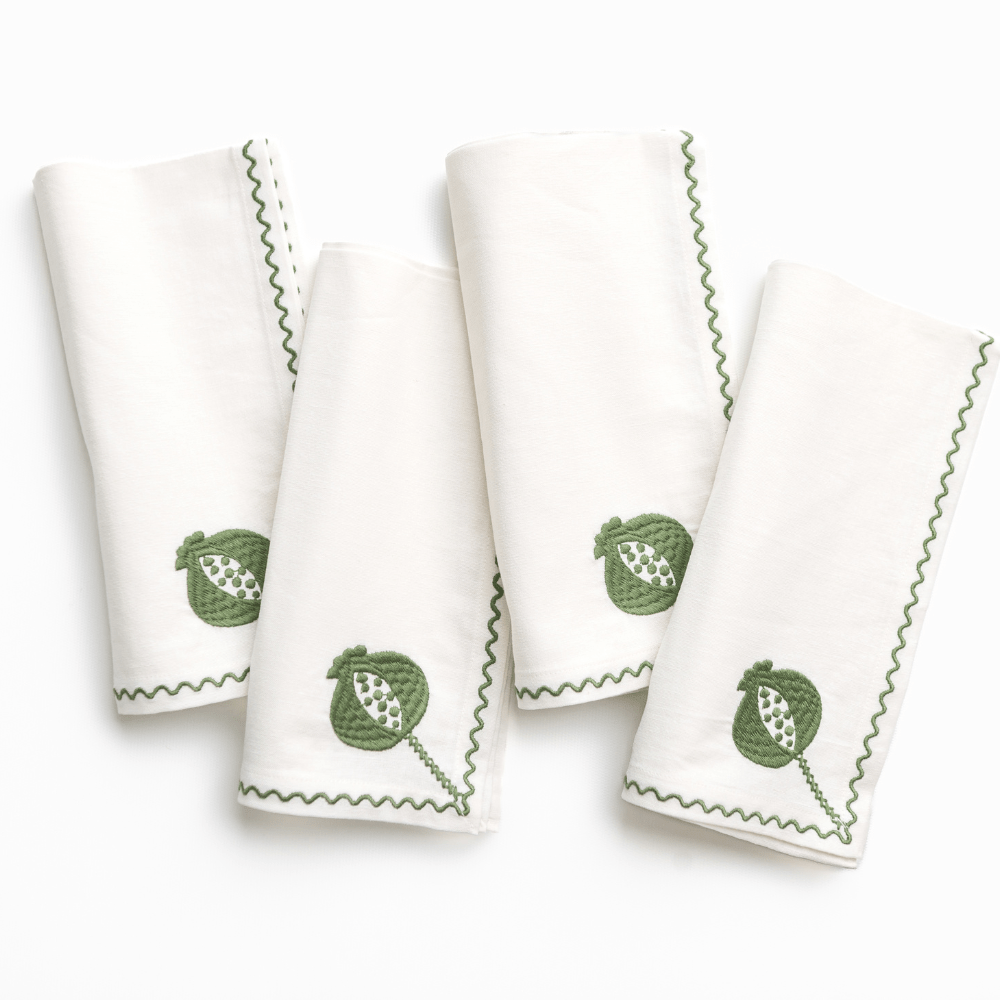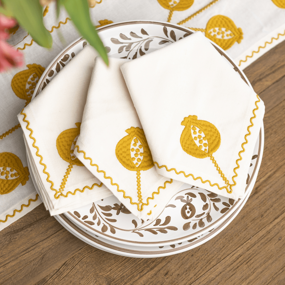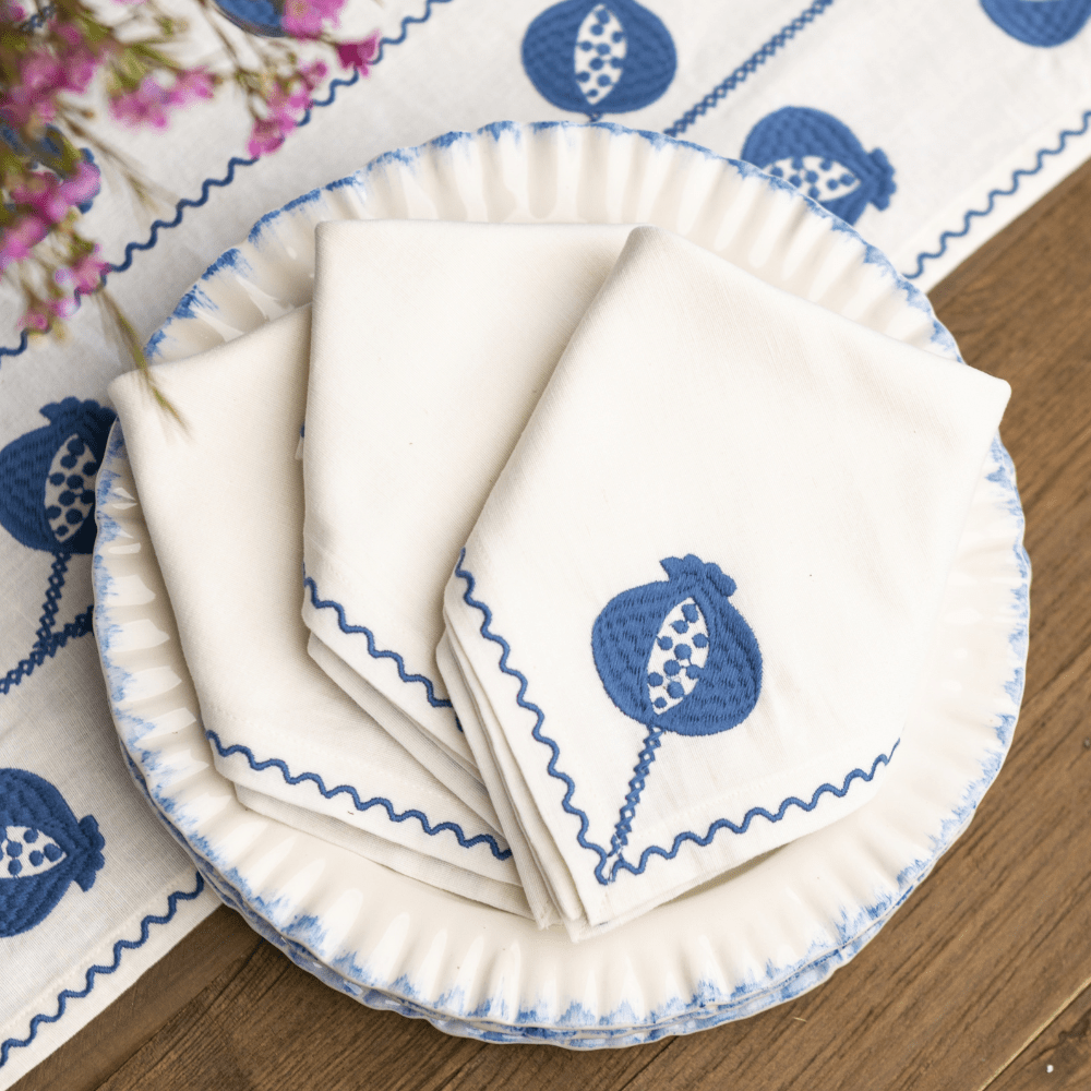 Our classic hand block-printed cotton napkins and elegant linen napkins are timeless Pomegranate staples. Featuring refreshing floral and geometric prints, each cotton napkin is hand-printed in vibrant colors, while our linen napkins are beautifully embellished with embroidery, scalloped edges, and decorative borders. Crafted by skilled artisans, these 100% cotton and natural linen napkins add the perfect hostess touch to everyday meals or festive gatherings. As signature pieces within our expanding table linens collection, Pomegranate napkins bring color, craftsmanship, and distinctive style to any tablescape.
