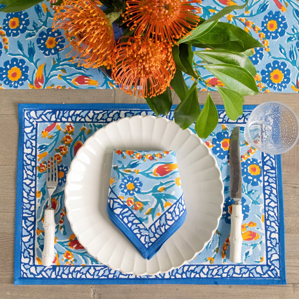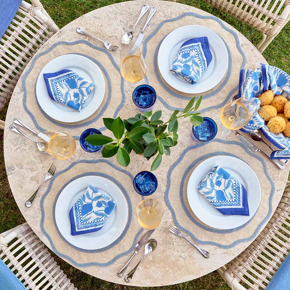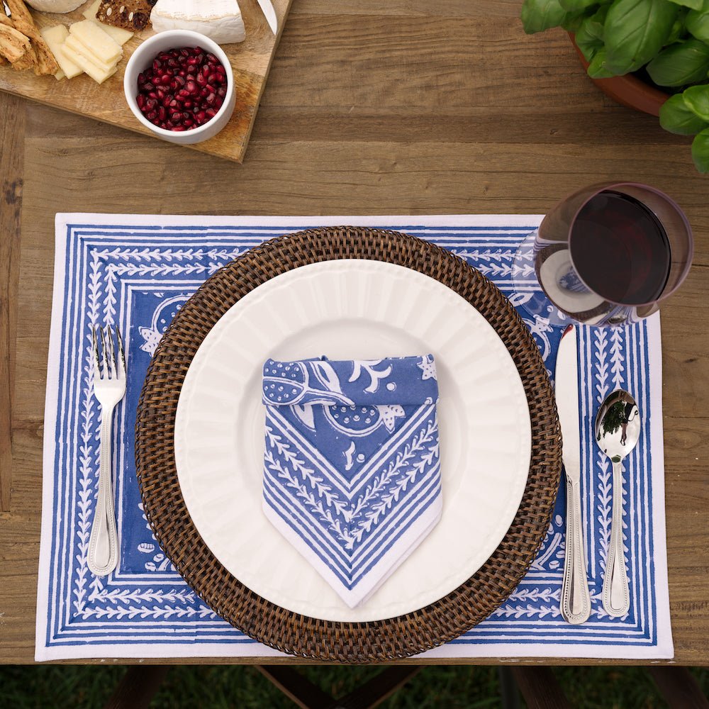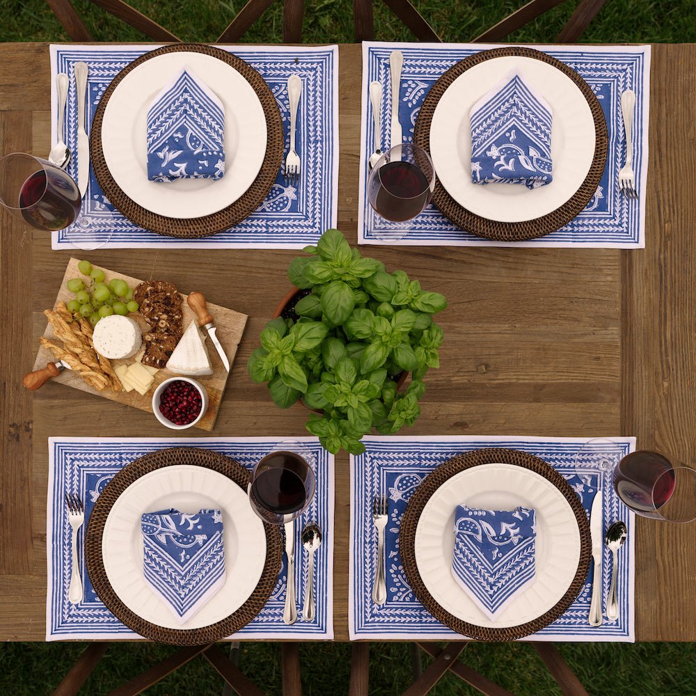Our blue and white collections feature timeless hand block-printed table linens and coordinating tableware that never go out of style. From elegant tablecloths and chic cloth napkins to placemats, runners, melamine dishes, and glassware, each piece is crafted for beauty and practicality. With shades ranging from classic navy to soft baby blue, these versatile designs complement any décor and occasion. Whether you’re hosting a formal dinner party or a casual brunch, our blue and white linens and accessories are easy to style, easy to care for, and always effortlessly elegant.
