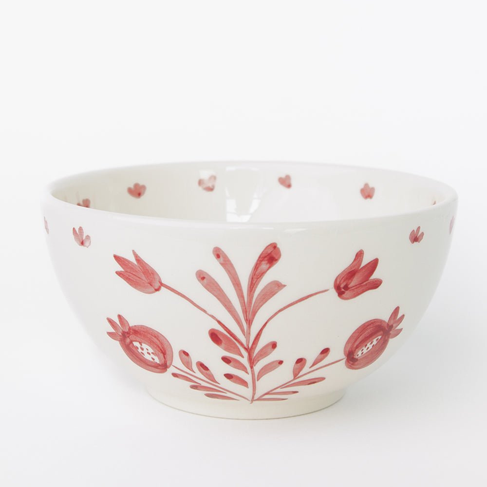 Serve soups, salads, or snacks in the charming Pomegranate Duet Rose Bowls. With hand-painted pomegranate motifs and botanical accents in a soft rose pink palette, these bowls add a fresh and elegant touch to any table. Available as a set of 2, these bowls are a perfect blend of style and practicality.