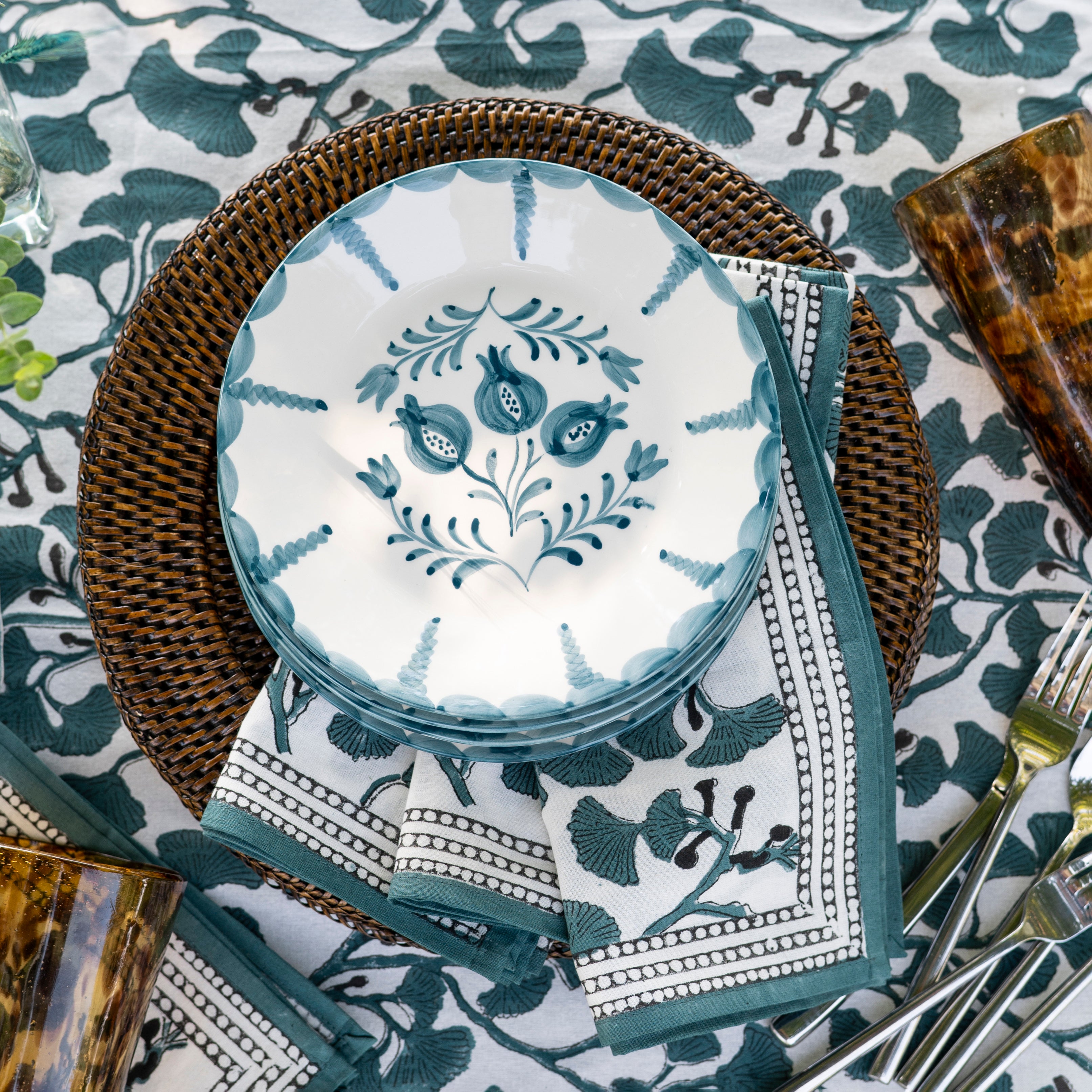 Set the table with our hand-painted ceramic Pomegranate Trio Vine Teal Salad Plates. Designed by Pomegranate founder and creative director, Angela Beck, each plate is beautifully hand-painted in Portugal with a stylized teal pomegranate vine pattern and framed by a soft scalloped edge. The set of 2 plates are perfect for serving salads, sides, or light meals, and add a brilliant pop of color to any occasion. Pair with the Pomegranate Trio Vine Teal Dinner Plate and Appetizer Plate to complete the look!
