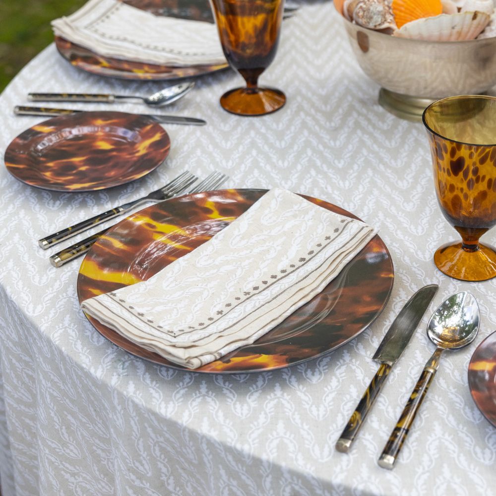 In the olden days, what we now see as the gold shoulder braid on high-ranking officers—called an aiguillette (pronounced “egg-wee-let”)—was originally just rope and pegs. It was carried on the shoulder by a knight’s aide-de-camp, ready to tether the knight’s horse. The ornamental braided cords with decorative metal tips are now worn on uniforms by officers to distinguish special and senior appointments, but wouldn’t it be fun if they were still used to tether the occasional horse? This hand block printed Chevron patterned napkin set draws its inspiration from those striking gold braids. It’s a modern take on tradition, perfect for bringing a bit of timeless style to any setting.