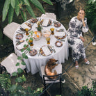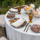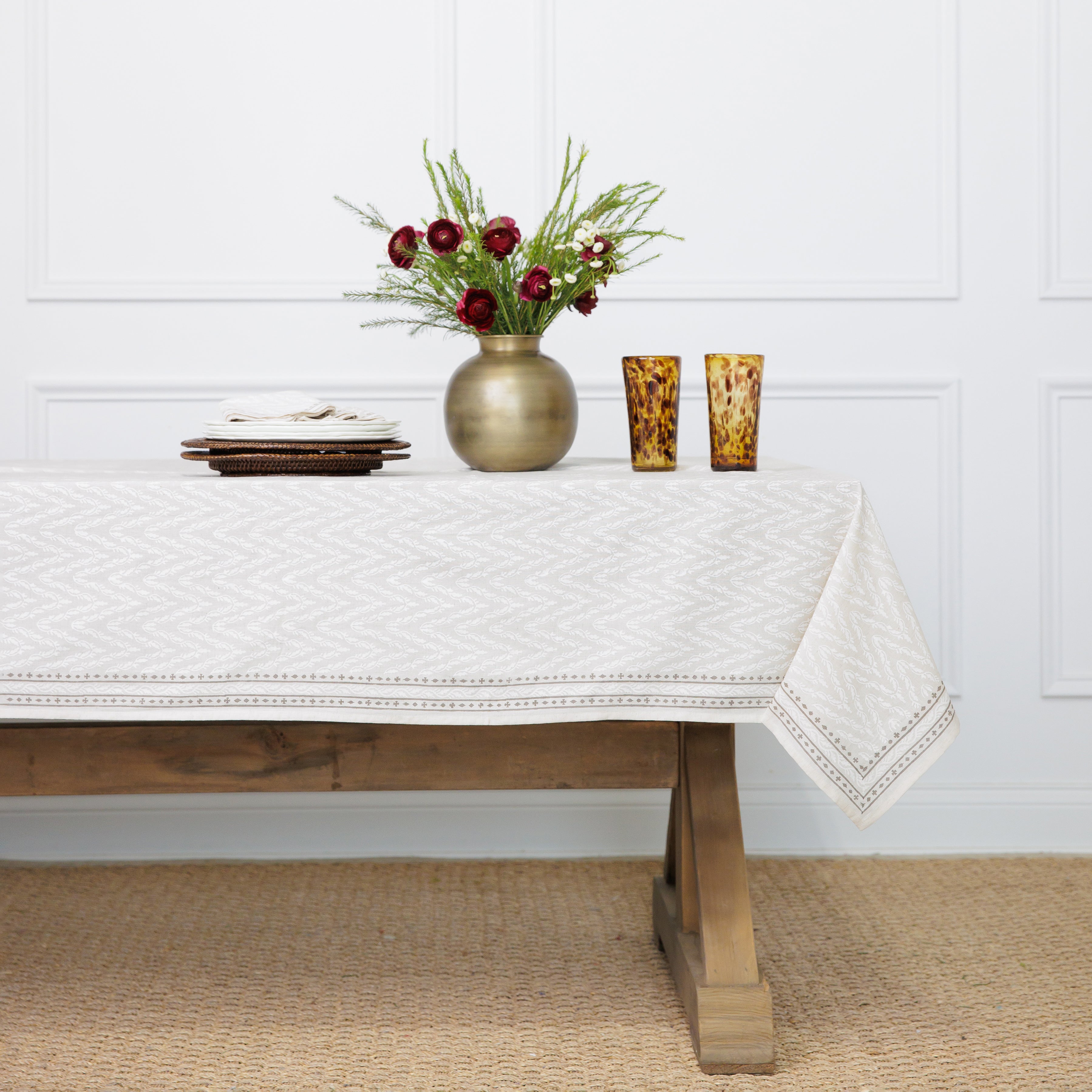 In the olden days, what we now see as the gold shoulder braid on high-ranking officers—called an aiguillette (pronounced “egg-wee-let”)—was originally just rope and pegs. It was carried on the shoulder by a knight’s aide-de-camp, ready to tether the knight’s horse. The ornamental braided cords with decorative metal tips are now worn on uniforms by officers to distinguish special and senior appointments, but wouldn’t it be fun if they were still used to tether the occasional horse? This hand block printed Chevron patterned tablecloth draws its inspiration from those striking gold braids.