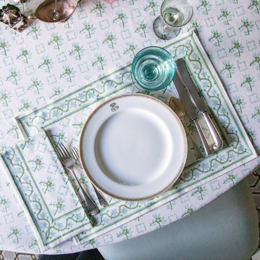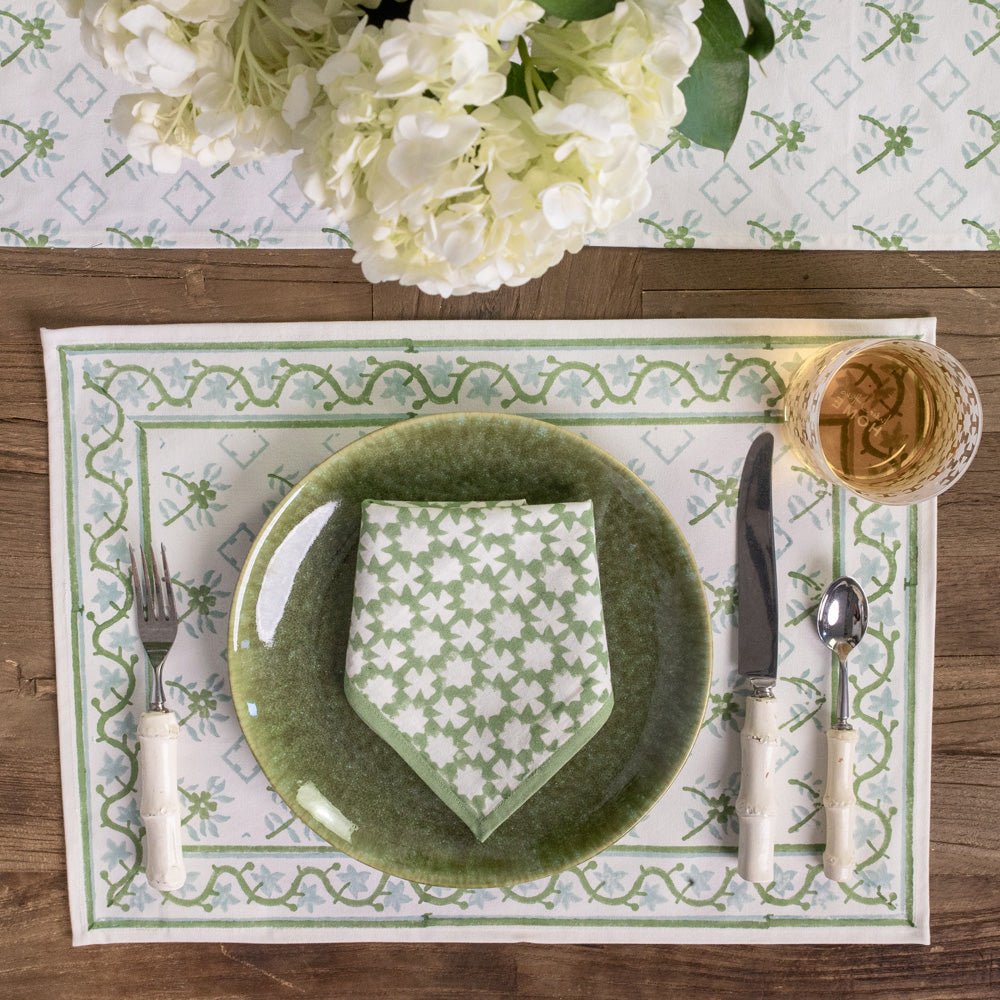The delicate floral pattern from these tiles, now hand block printed in soothing Palladian Blue and Soft Sage, adorns these placemats. Ideal for both casual and formal gatherings, adding a touch of elegance to any setting.