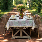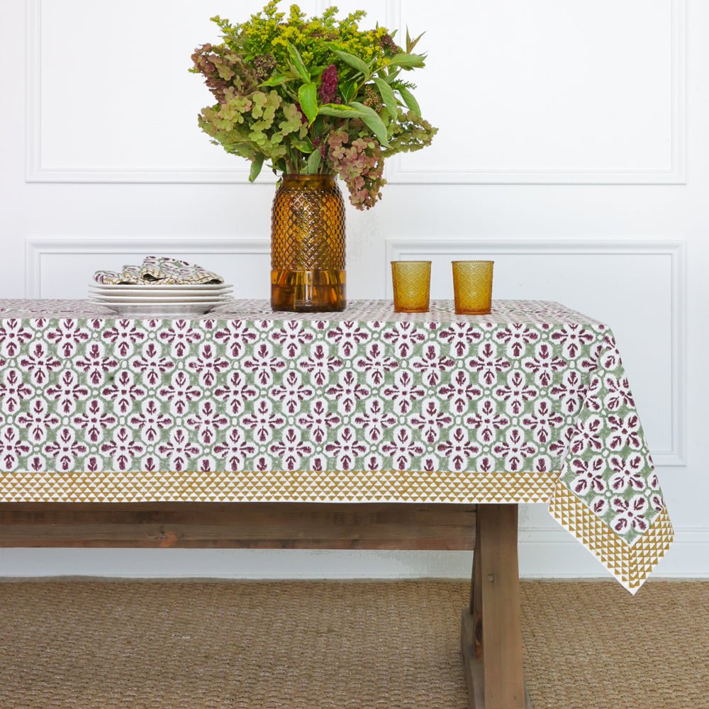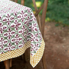Set the stage for memorable meals with our Fleur de Lis Antique Jade Tablecloth. The eye-catching Fleur de Lis pattern in jade green hues, surrounded by a yellow geometric border, instantly enhances any table setting. This hand block printed tablecloth is crafted from 100% cotton for a soft, breathable feel. Whether for everyday dining or festive occasions, this elegant tablecloth creates a warm and inviting atmosphere.