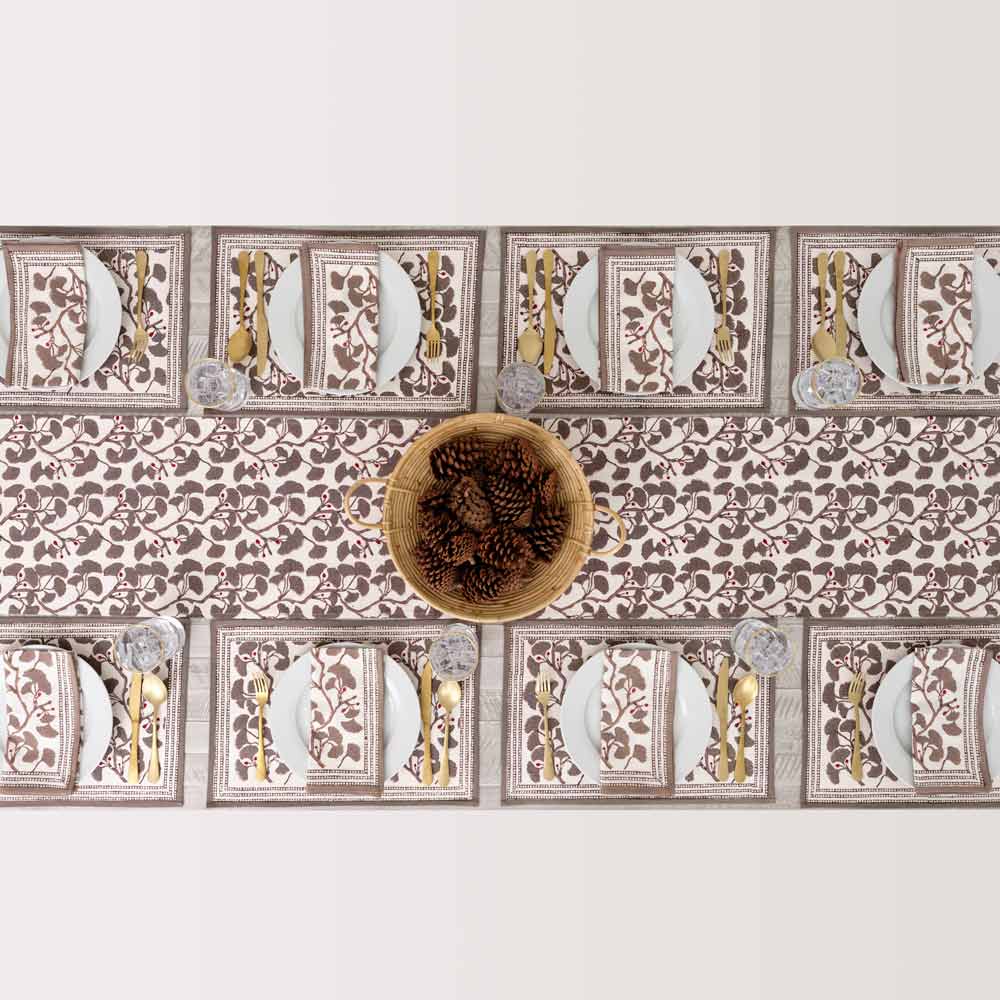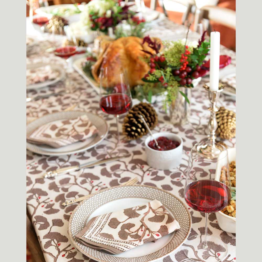 Warm and toasty, our Ginkgo Taupe linens are welcoming and elegant. One of our most popular prints is recolored for your more subtle gatherings. Rich brown and taupe hues are at home anywhere. So chic and fanciful. Tablecloth shown here