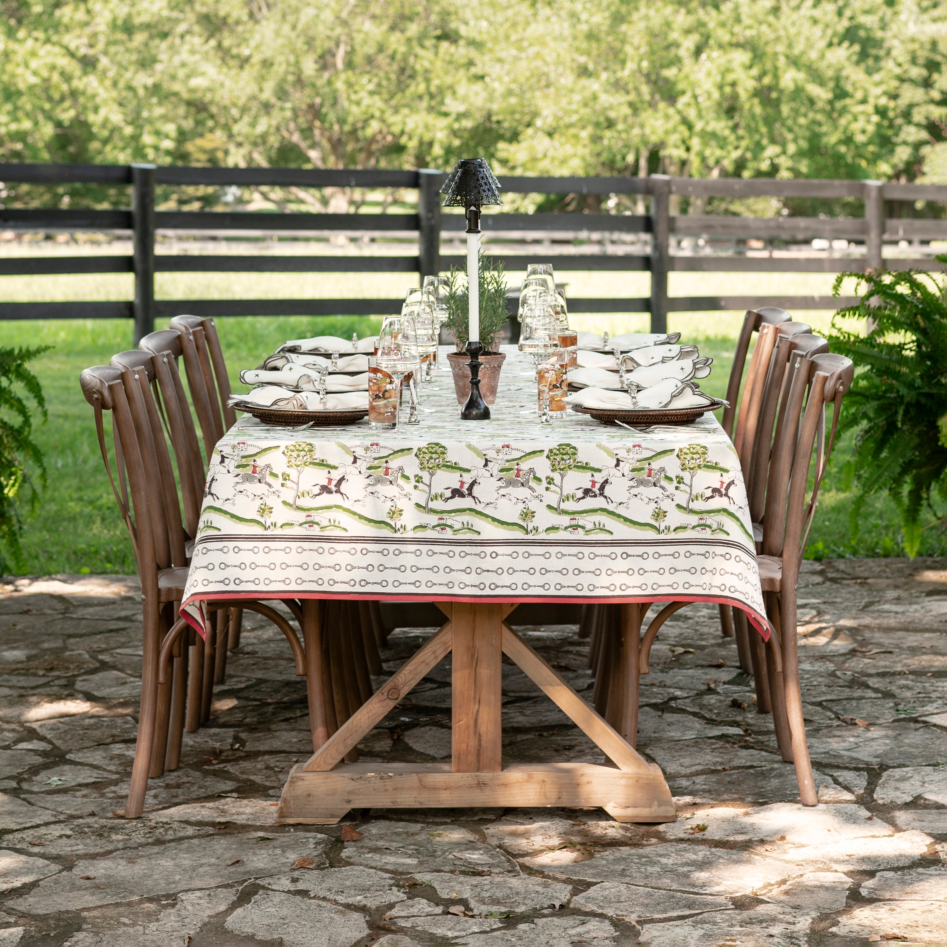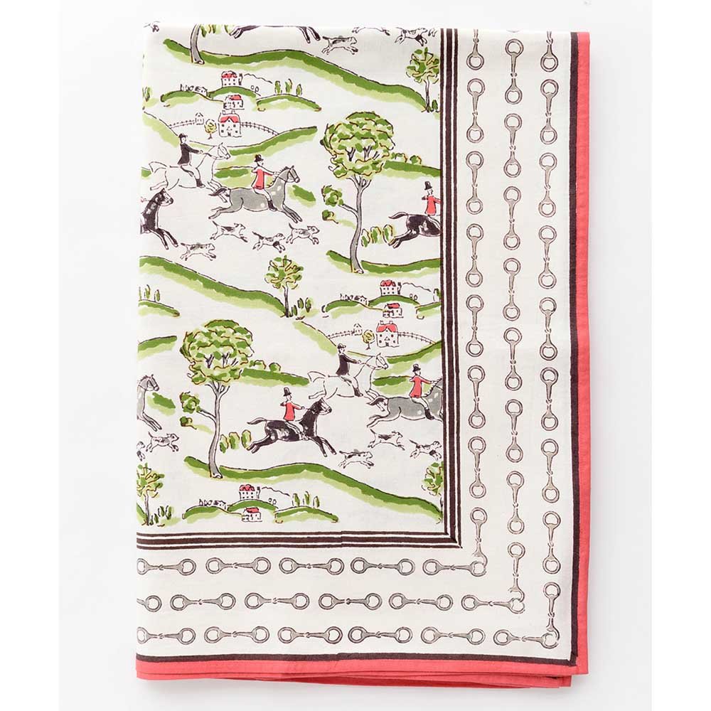 Off to the hunt! For the equestrian enthusiast, elevate your table with our exclusive equestrian hunt scene table linens. Featuring our unique hunt scene print with a red and snaffle border, this print brings sophistication to both everyday and formal gatherings with a hand drawn motif unlike anything you have seen. Have all your party guests buzzing about your table decor.