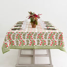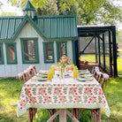 The sweet shape of young pomegranates inspired this print, which features the fruit in both its baby and mature stages. Lively tree branches with vibrant green leaves end with plump pomegranates in coral and salmon hues. This tablecloth pairs beautifully with the Pomegranate Green napkins and Natural Bamboo Cane Placemats.