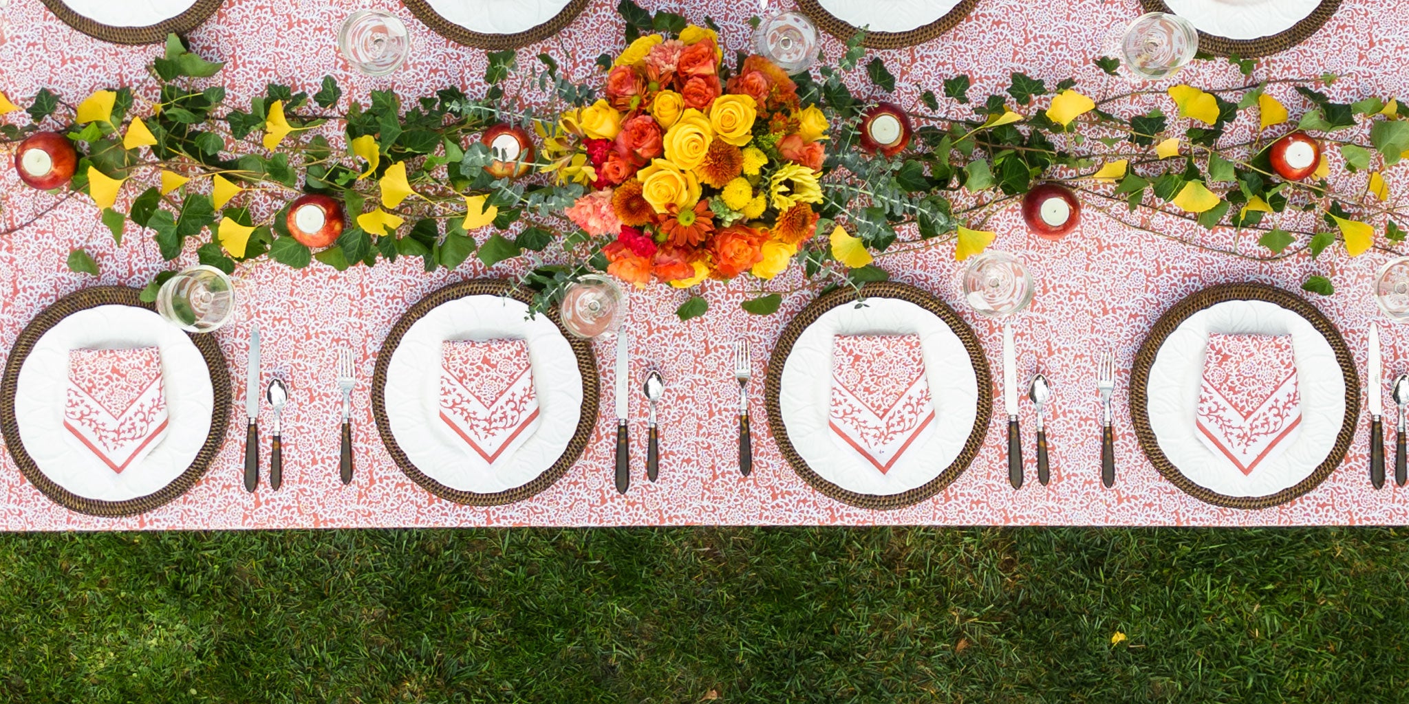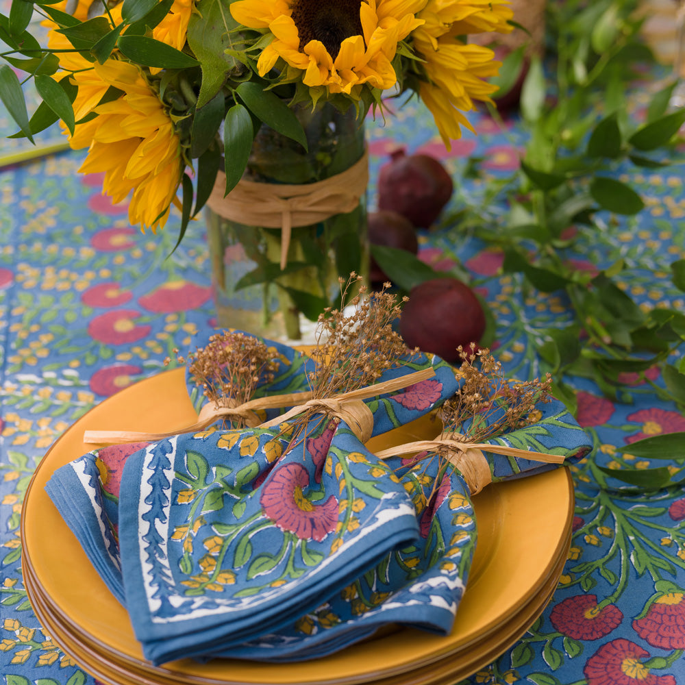 For over 25 years we have been designing by hand, exclusive block printed linens in refreshing prints and hues. We're here to help with your request. Whether it be a sizing question, wedding or private event, or a custom project—we hope we can help set your table with ease and style.