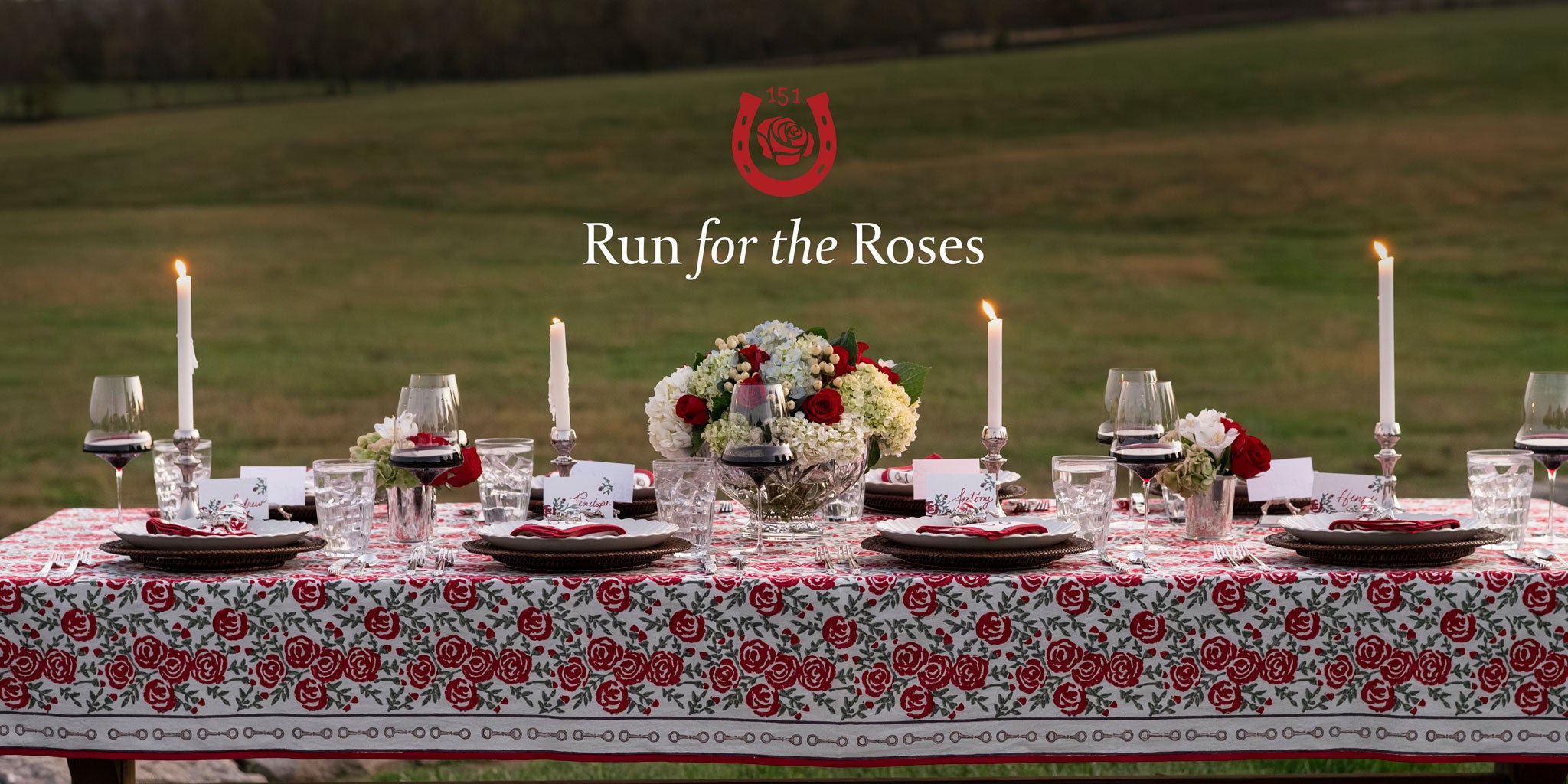 Celebrate the 151st running of the Kentucky Derby in style with our Run For The Roses 151 Collection, a limited-edition tribute to the most thrilling two minutes in sports. Inspired by the time-honored tradition of draping the winning Thoroughbred in a garland of fresh red roses, this collection features hand-blocked prints of bold red roses and lush greenery, elegantly framed by a classic snaffle bit border. Each piece is hand stamped with "151" to mark this historic milestone and finished with an exclusive sewn-in label—a true collector’s touch for any racing enthusiast.