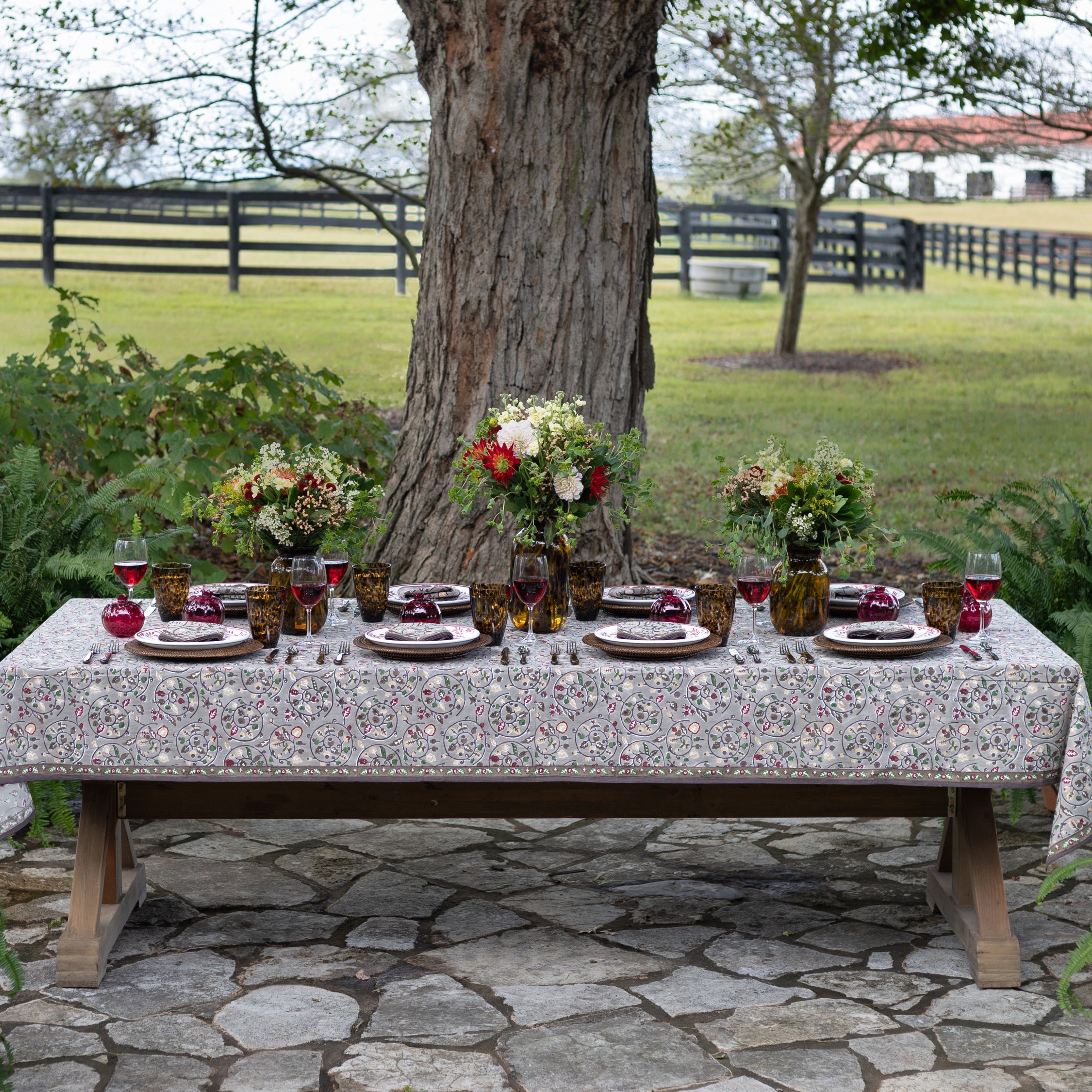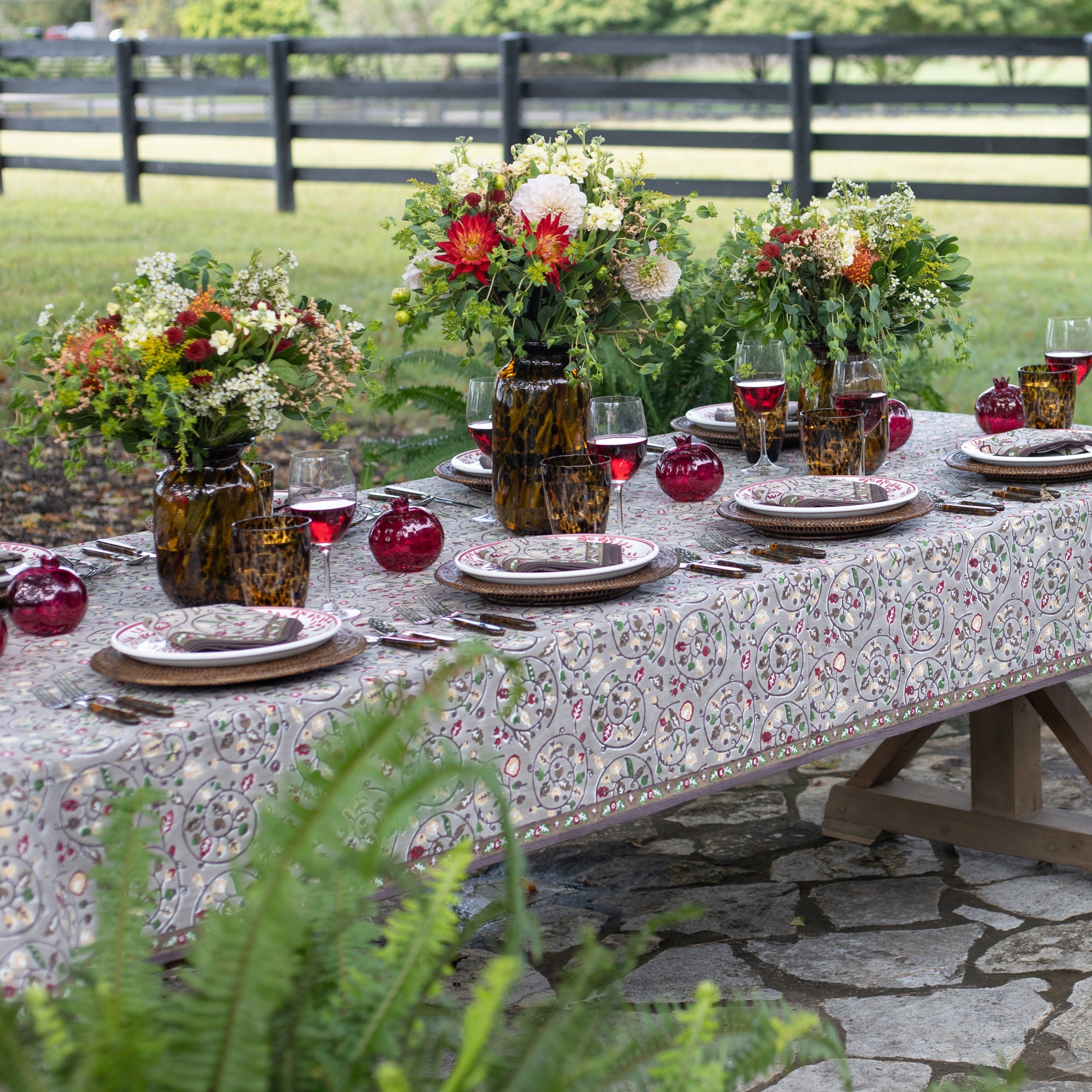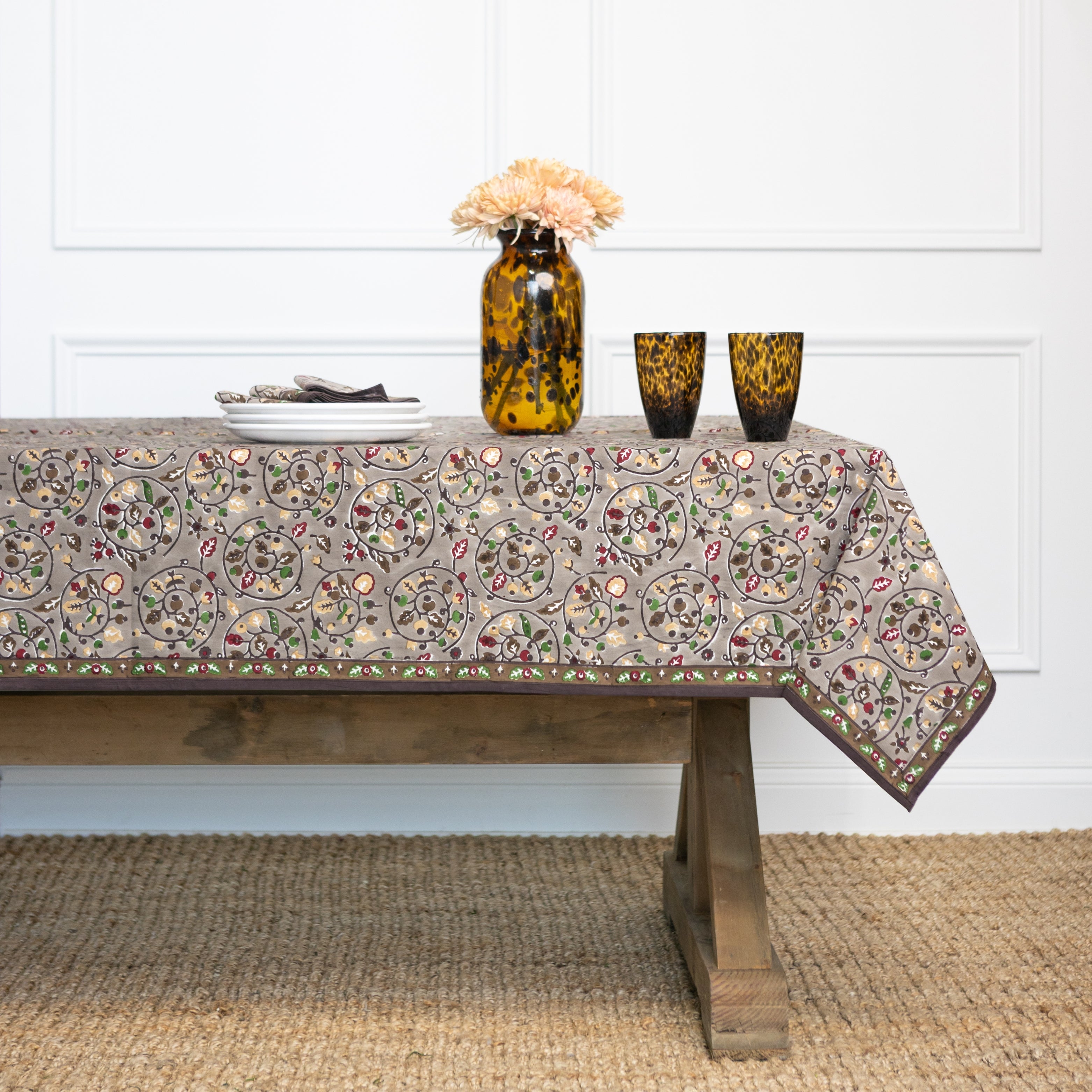 Set the scene for memorable meals with our Acorn & Berries Tablecloth. Embroidered with intricate leaves, berries, and vines, this richly textured linen captures the essence of autumn. A warm brown border frames the design for a polished finish, making it a stunning centerpiece for any dining occasion—from harvest feasts to holiday dinners.