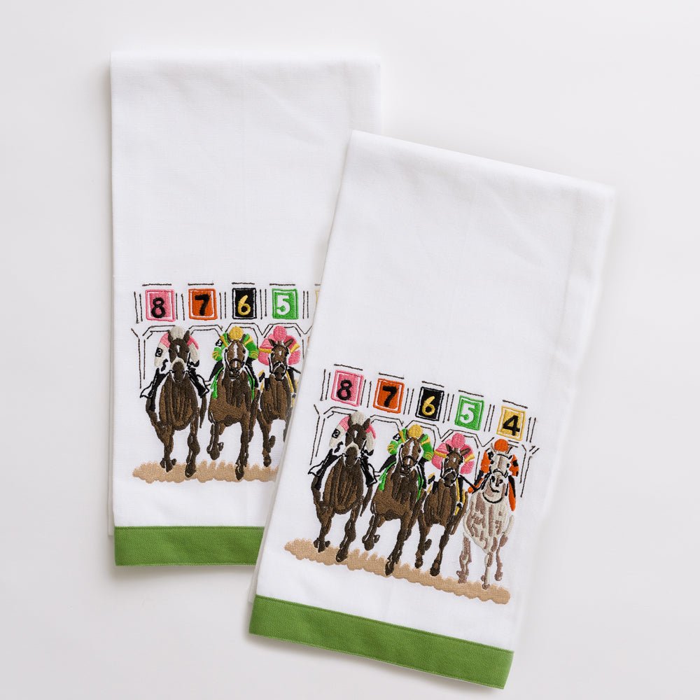 Away They Go! These limited-edition, equestrian embroidered hand towels make a great hostess or housewarming gift. These unique napkins feature 4 embroidered horses and colorful jockeys bursting from the gate with red border detail. Designed for everyday use.