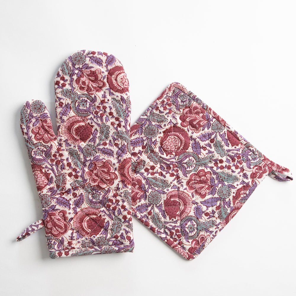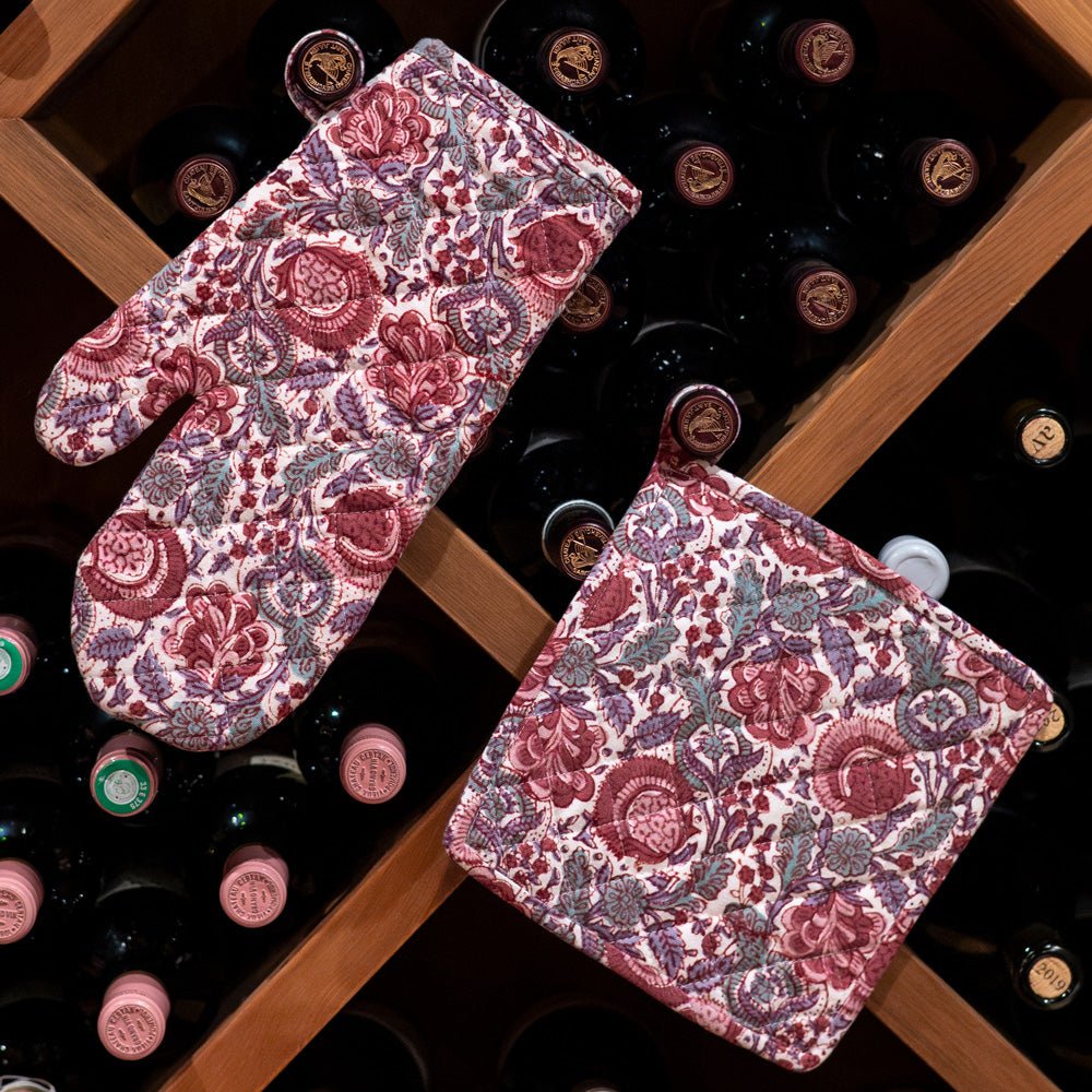 Bring a touch of artistic flair to your kitchen with the Bohemian Floral Dusty Rose Oven Mitt Set. Each mitt is hand block printed with a bold and intricate floral design, showcasing shades of dusty rose & lilac. Made from 100% cotton, these mitts offer excellent heat resistance and a comfortable grip, ensuring your hands stay protected while you cook.