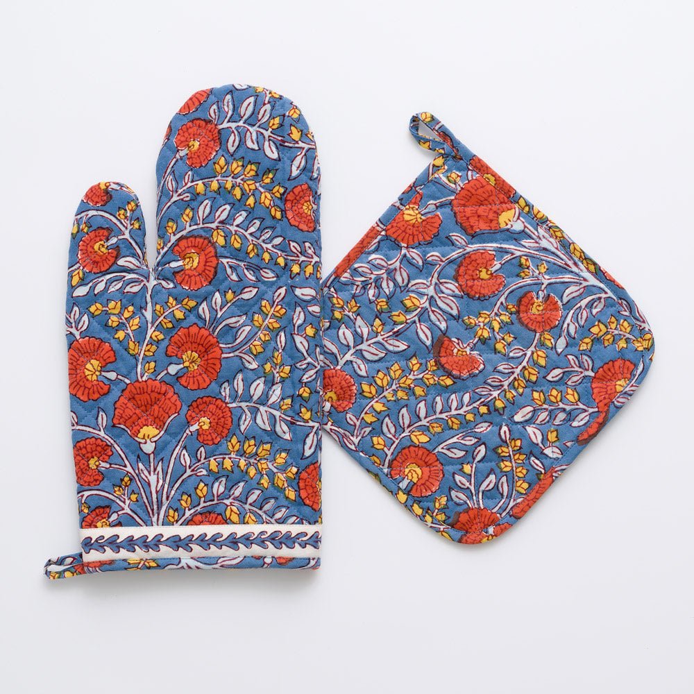 Cactus Flower Blue & Poppy Oven Mitt Set