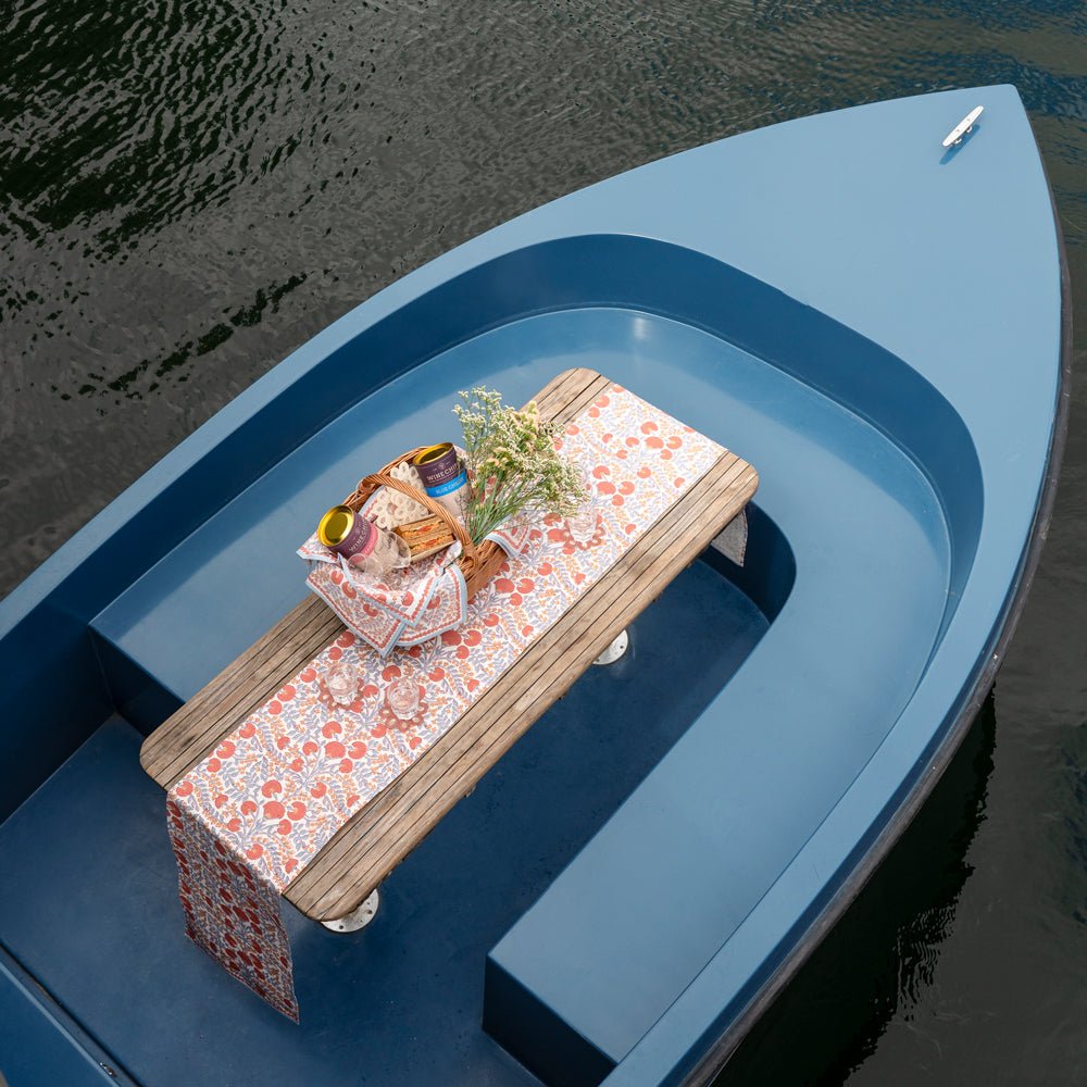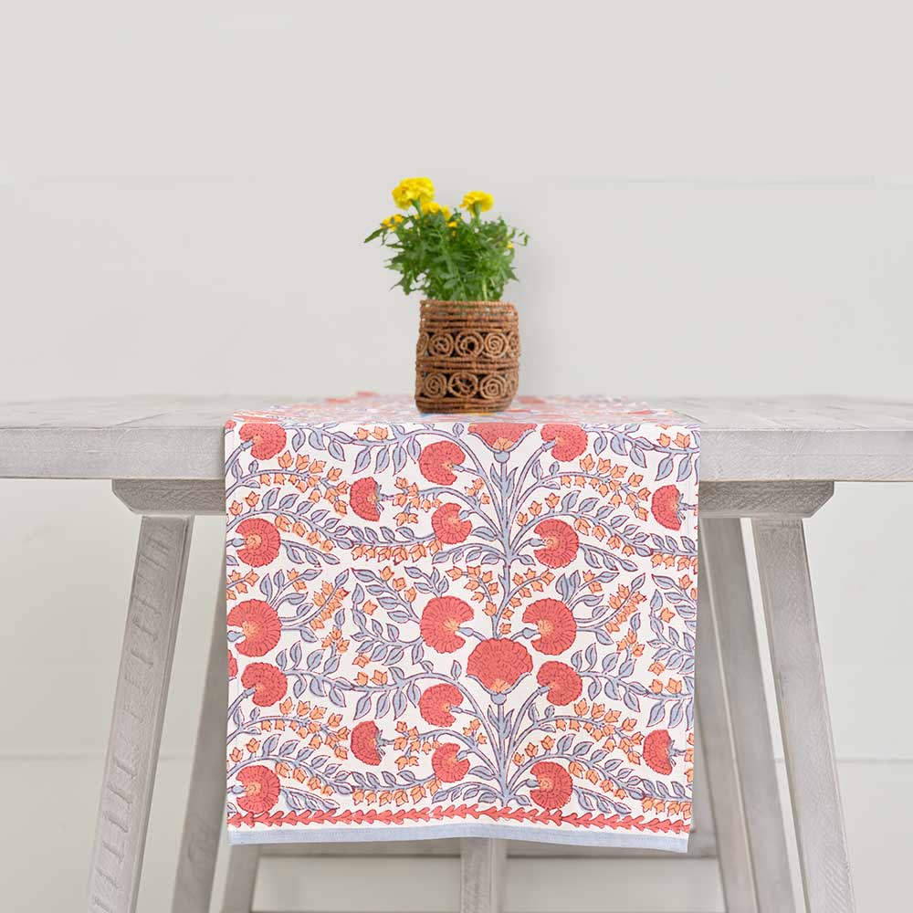 Introducing a beautiful new print that is predicted to be a best seller year round! This floral print showcases periwinkle vines with warm orange blooms and earthy undertones. Perfect for day or night and all seasons, it is sure to bring a colorful but calming energy to your dining experience.