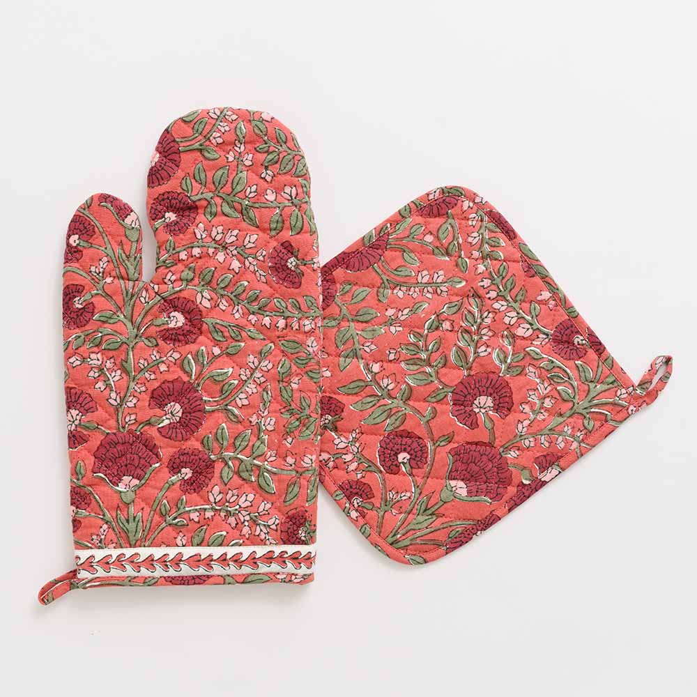 Shield your hands from heat with our Cactus Flower Red Oven Mitt Set. Crafted from quilted fabric, this luxurious set features vibrant shades of chili red and burgundy florals entwined with sage green vines, making it a unique and beautiful kitchen accessory. Whether you're baking batches of holiday cookies, roasting a Thanksgiving turkey, or whipping up a cozy fall stew, our Cactus Flower Red Oven Mitt Set is the perfect companion for creating sophisticated and stylish culinary moments.