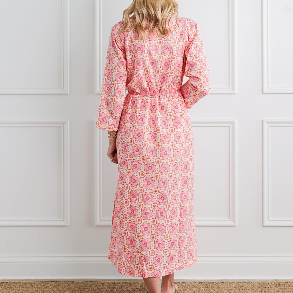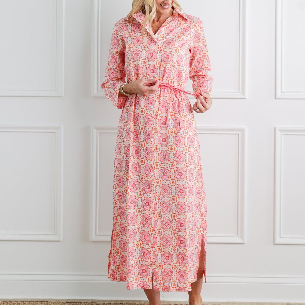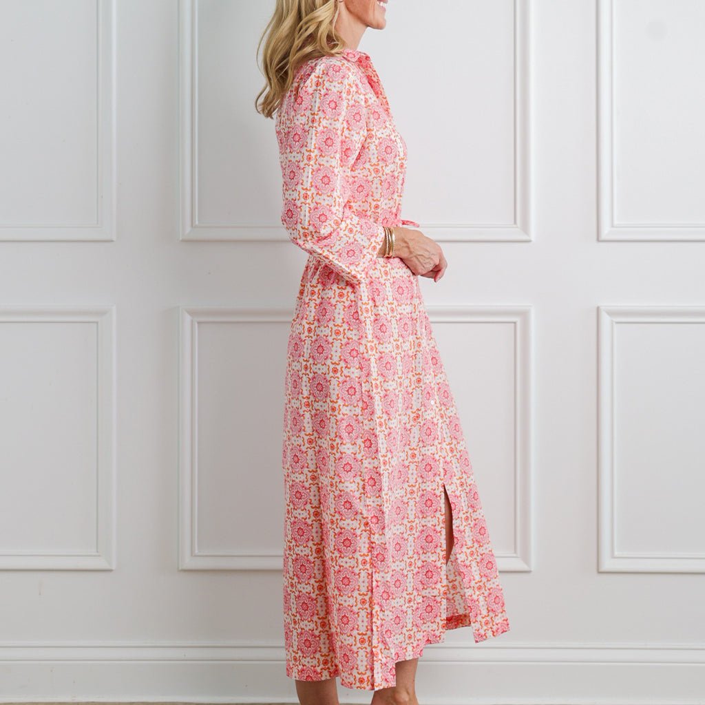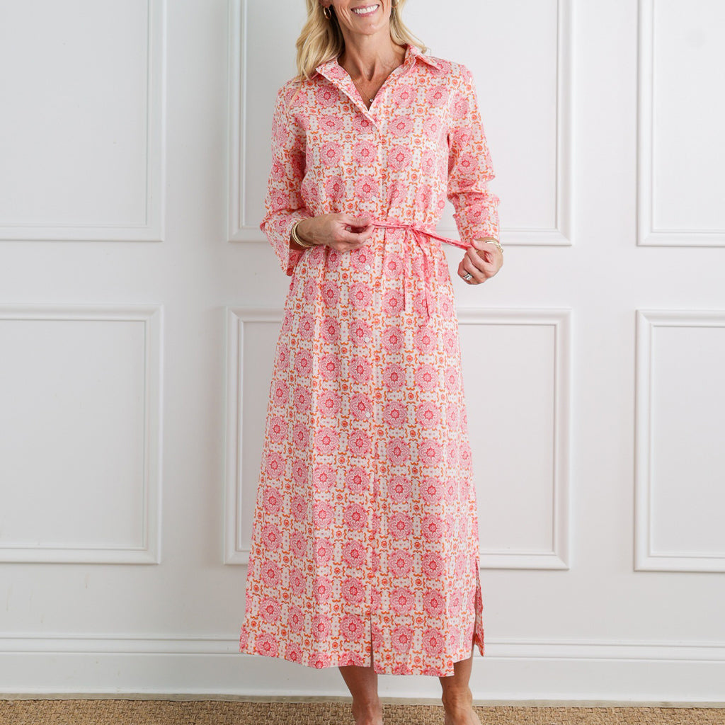 In this long button down dress, the Celia Citrus print comes alive in graceful vertical lines. The silhouette is easy and flattering, perfect for warm days, travel, or gatherings by the water. Wear it loose or softly shaped with a belt. A radiant style that feels polished without effort.