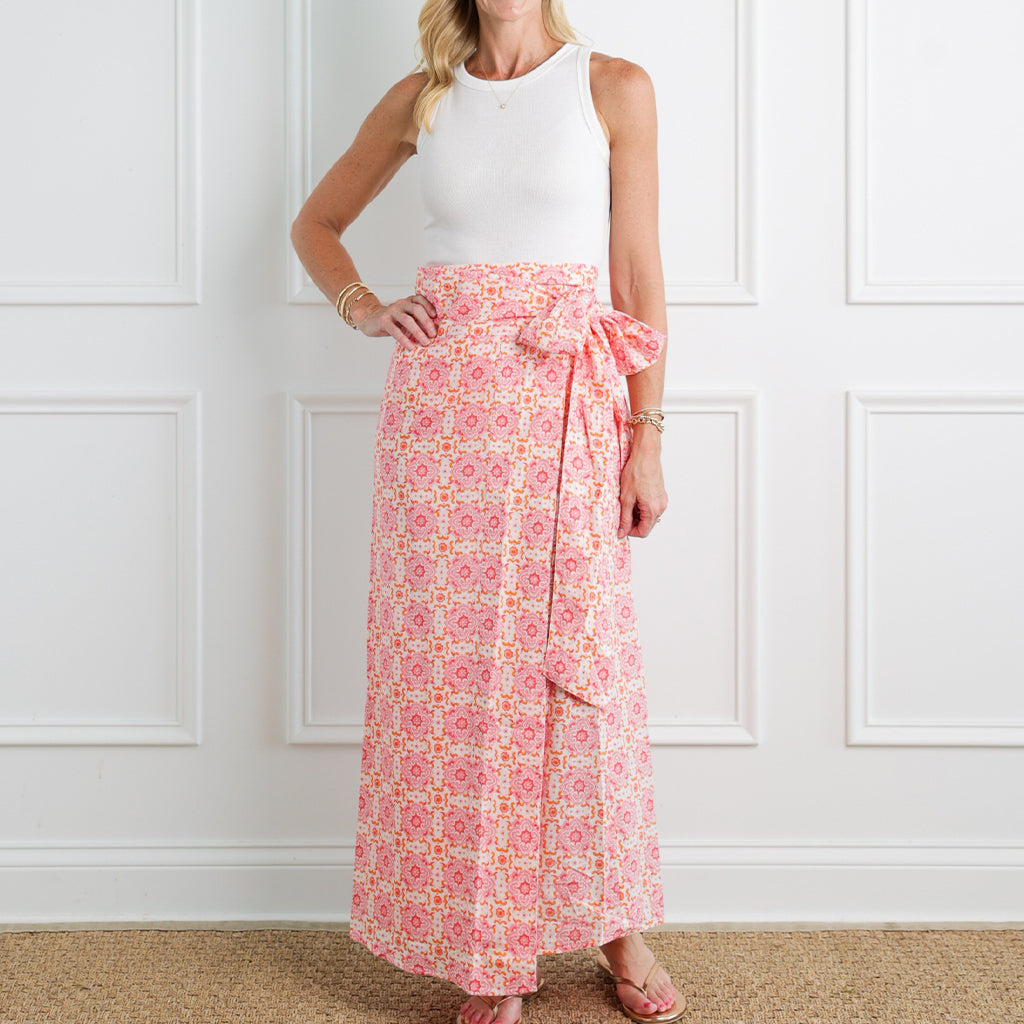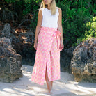 Lightweight and breezy, the Celia Citrus sarong brings a splash of color to poolside afternoons and beach days. It ties smoothly as a skirt, wrap, or coverup, making it a warm weather essential. The print feels playful and polished at once. Simple, flattering, and endlessly useful.