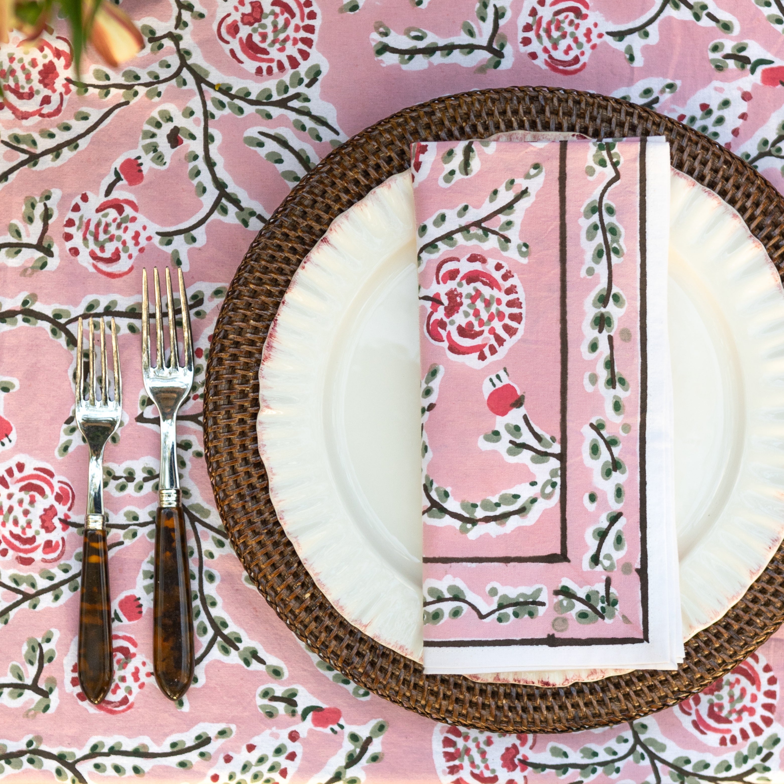 Celebrate the season with a softer touch using our Climbing Dahlia Rose Napkins. Hand block printed with festive red and green dahlias against a rosy pink background, these cotton napkins bring refined holiday cheer to your table. Perfect for Christmas brunches, winter gatherings, or year-round entertaining with a floral twist.