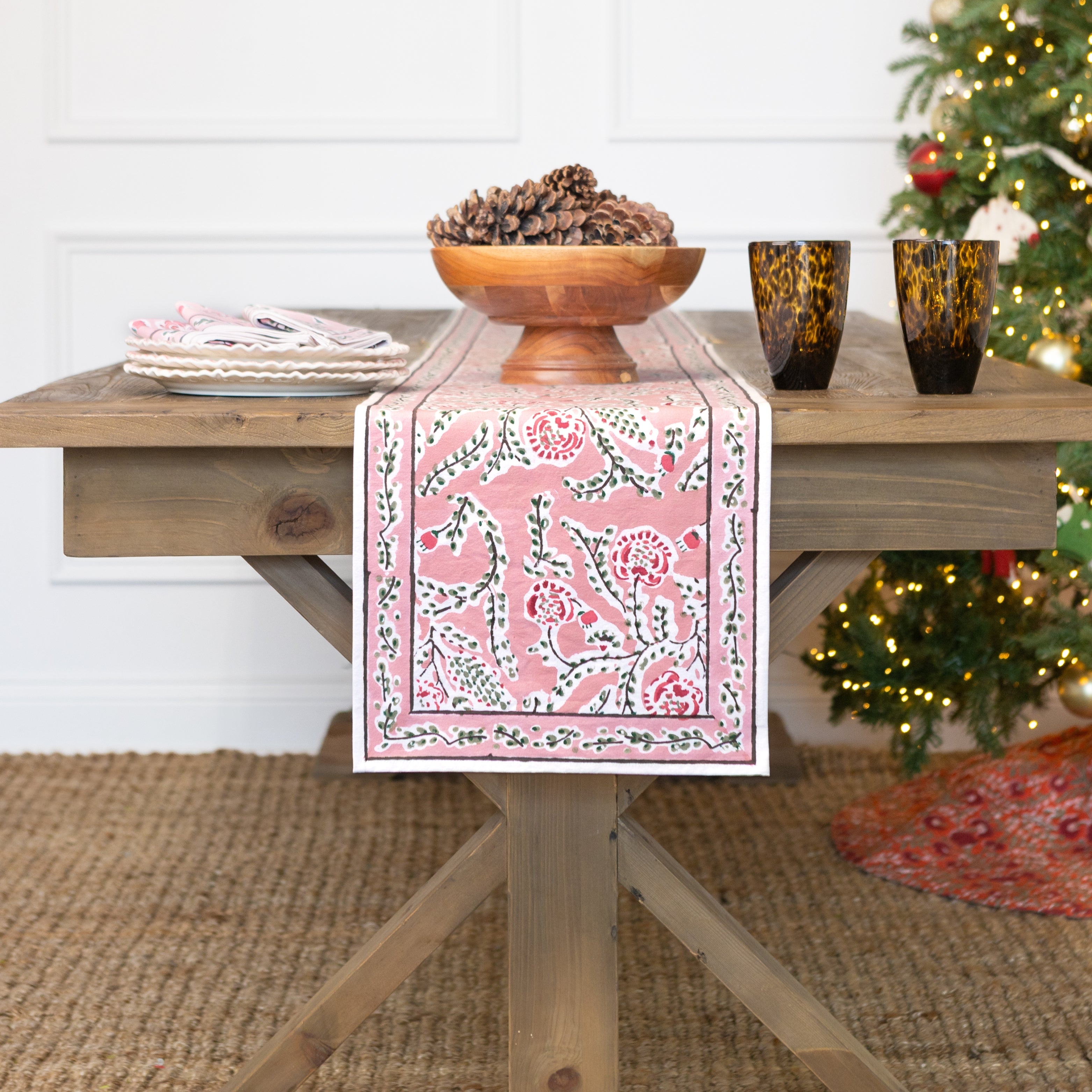 Dress your table in festive florals with our Climbing Dahlia Rose Table Runner. Hand block printed in rich shades of red and green on a rosy pink base, it sets a joyful, elegant tone for holiday gatherings. Pair with glowing candles or greenery for a perfectly polished look.