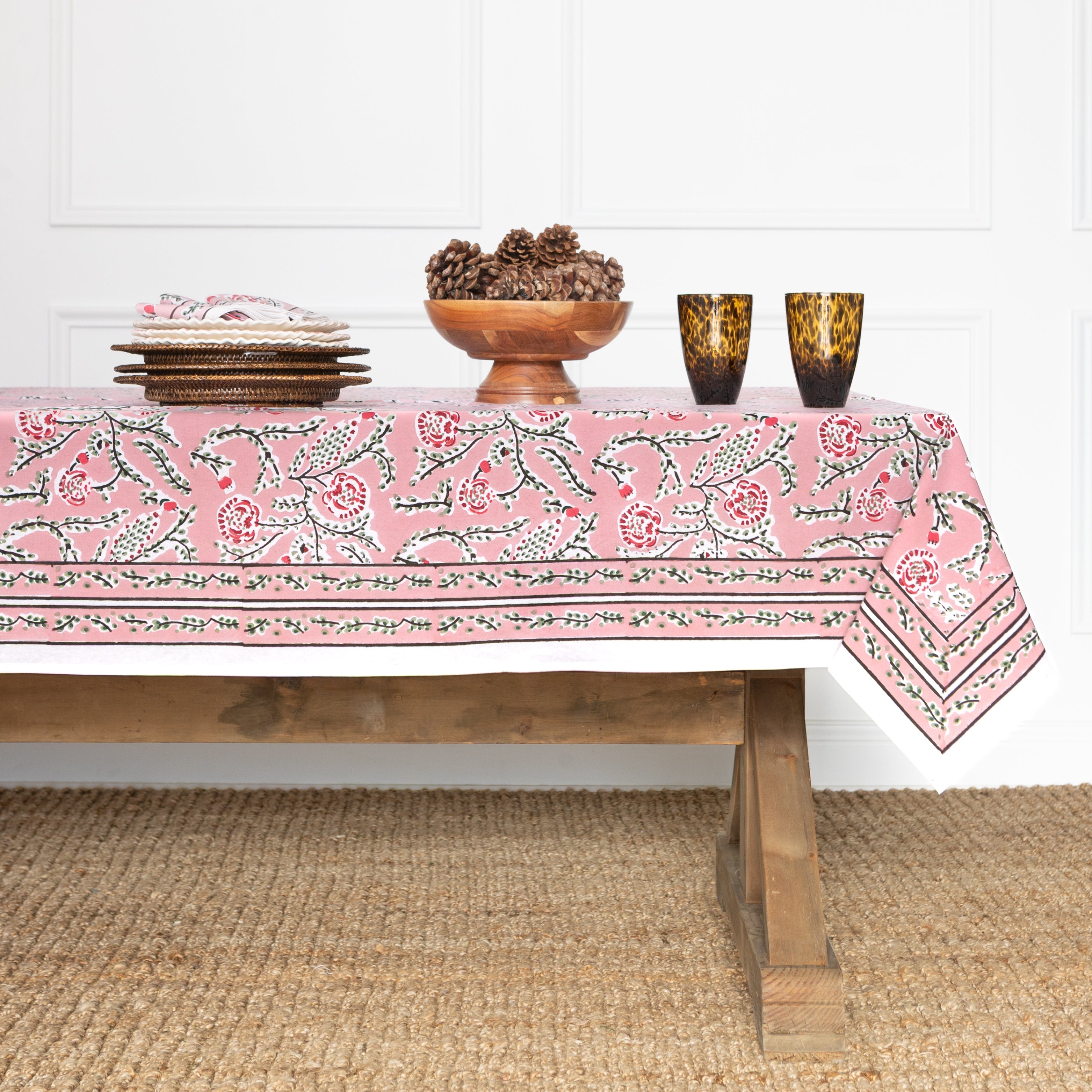 Set a merry and bright holiday table with our Climbing Dahlia Rose Tablecloth. Hand block printed in a palette of pink, red, and green, this cotton tablecloth brings a festive yet graceful look to Christmas dinners and seasonal celebrations.