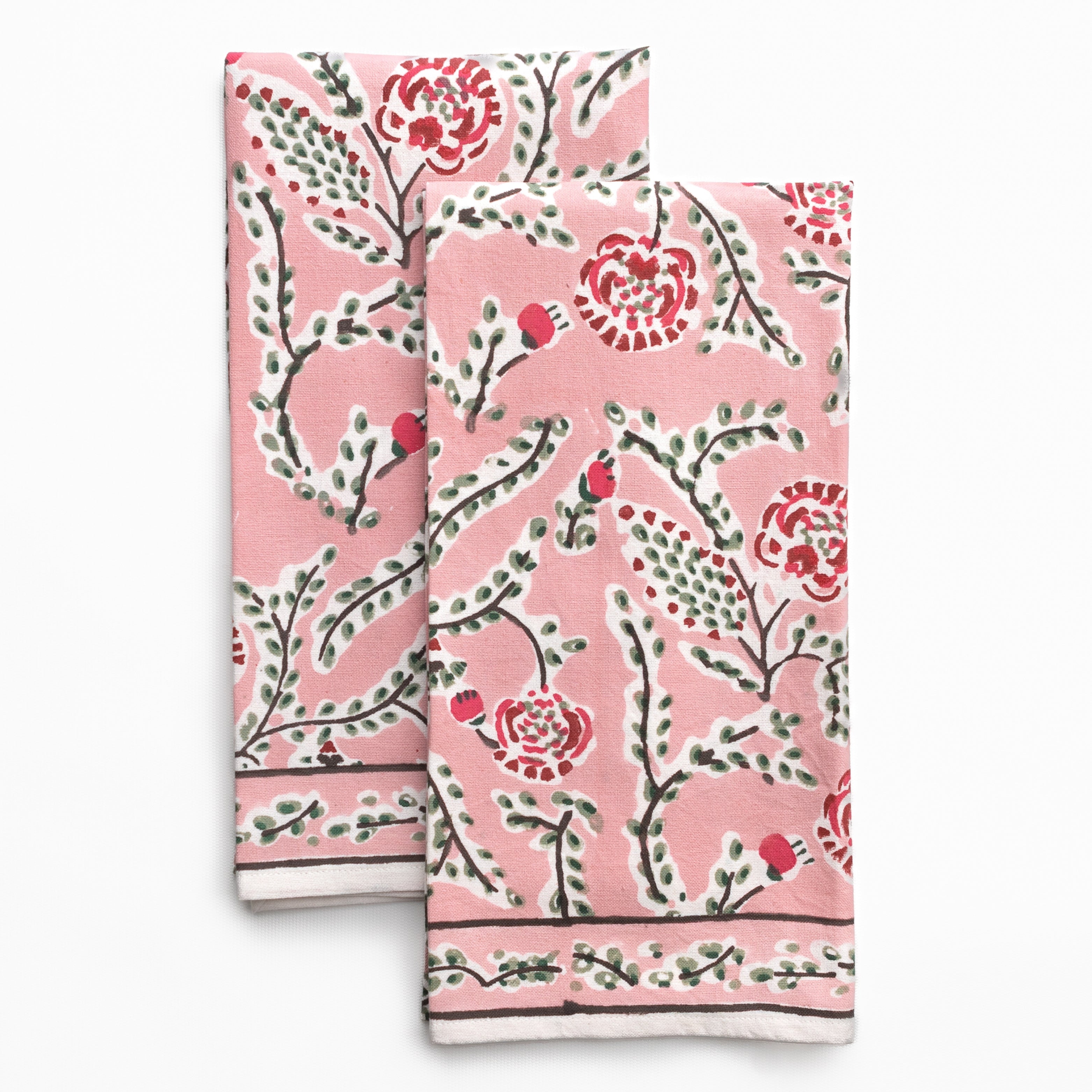 Bring a dash of holiday beauty to your kitchen with our Climbing Dahlia Rose Tea Towels. Hand block printed with red and green dahlias on a rosy pink background, these cotton towels offer cheerful color and artisanal charm—perfect for gifting or adding seasonal spirit to everyday tasks.