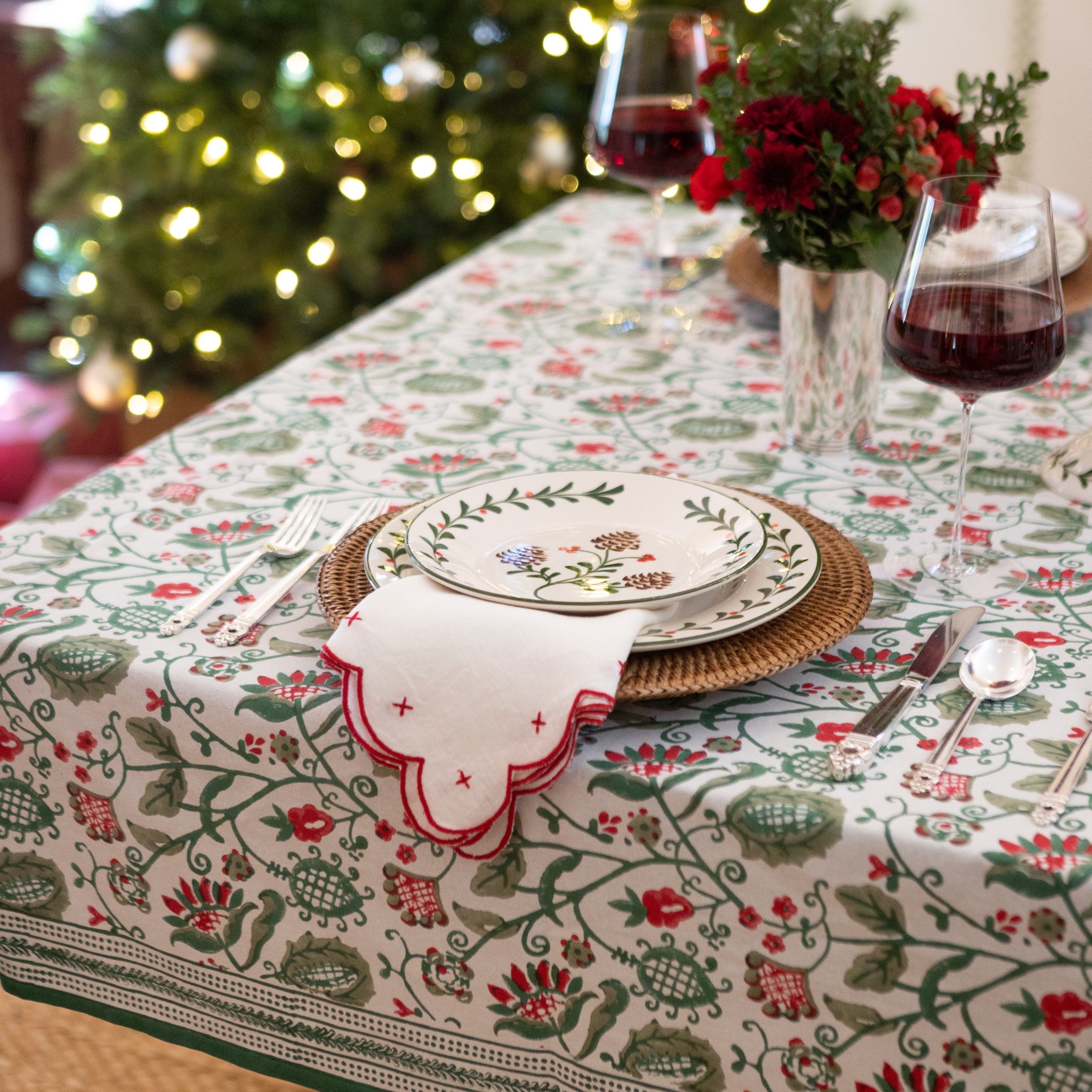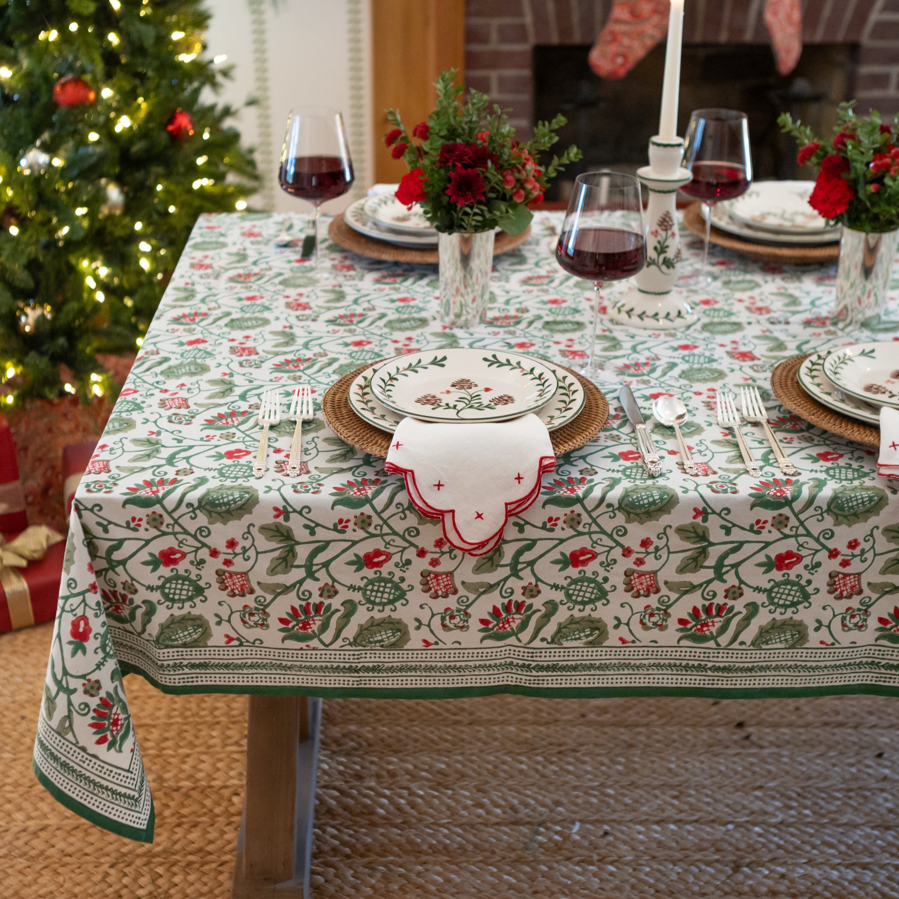 Set the tone for a season of celebration with our Con Con Red & Green Tablecloth. Featuring hand block printed florals and vines in cheerful holiday hues, this cotton tablecloth blends heritage craftsmanship with timeless design. It’s the perfect foundation for festive dinners, family feasts, and cozy winter brunches alike.