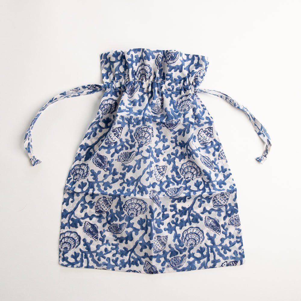 Blue and white coral and shells are hand-painted and block printed on this multi purpose drawstring bag! Use it as a carry-all or to wrap your gifts in!