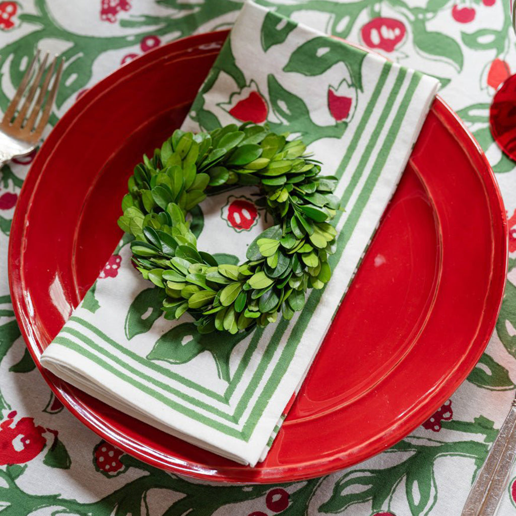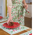 Bring cheerful holiday charm to the table with our Emma Red and Green Holiday Entertaining Essentials Bundle, a coordinated collection crafted to make seasonal hosting beautifully effortless. Hand block printed by artisans in India, each napkin and placemat features the fresh, lively Emma motif, where bright red blossoms and winding green vines are stamped onto soft cotton using traditional carved wooden blocks. The result is a crisp, joyful pattern full of depth, character, and the subtle variations that define true artisan craft.