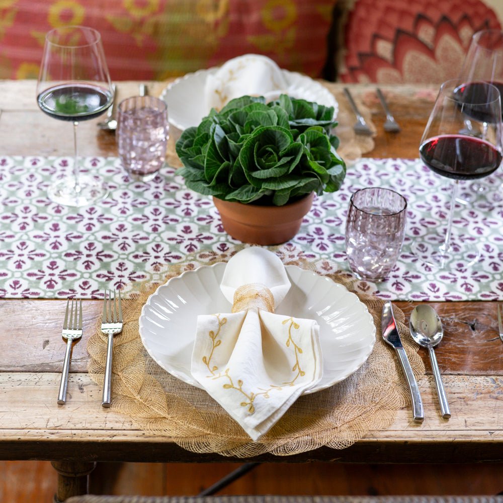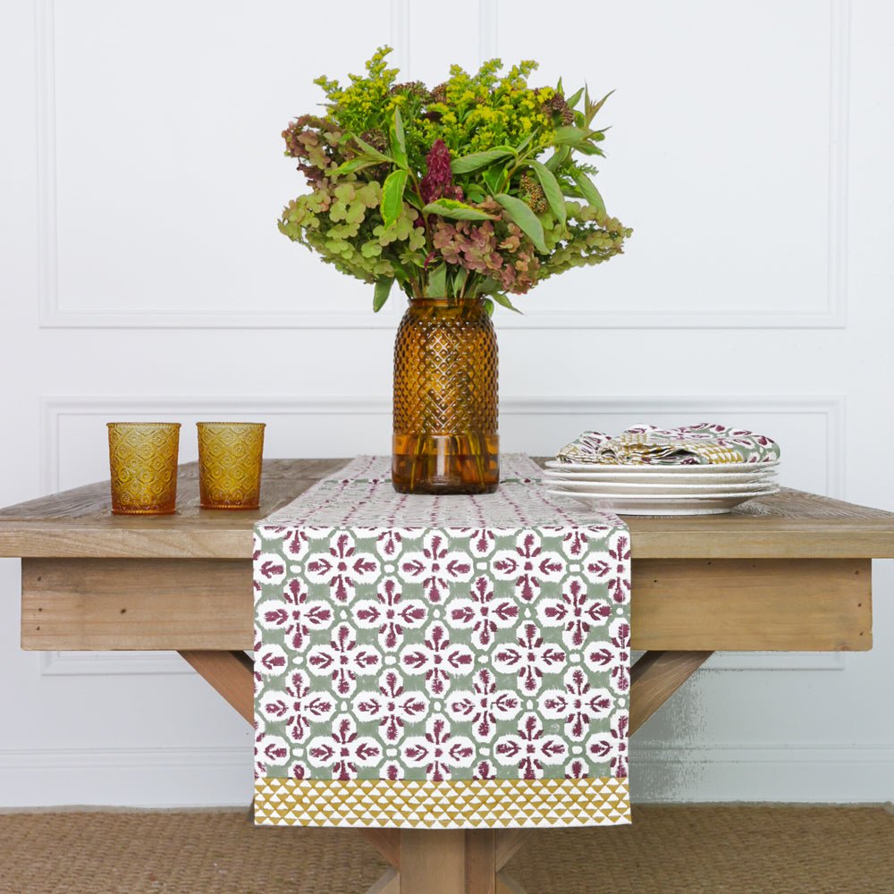 Transform your table into a work of art with the Fleur de Lis Antique Jade Table Runner. The regal Fleur de Lis pattern in jade green, framed by a yellow geometric border, adds elegance and charm to any table setting. Whether used for casual gatherings or formal events, this hand block printed runner brings timeless beauty to your dining room. Made from 100% cotton, it’s both stylish and easy to care for.