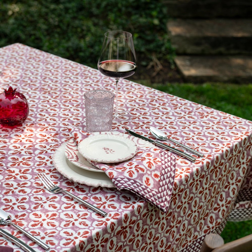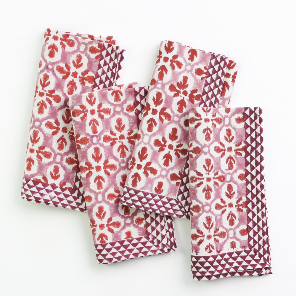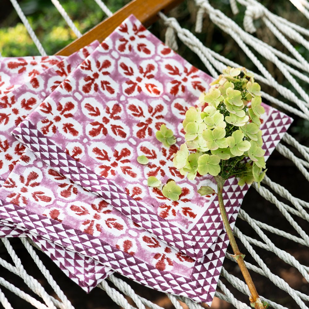 Elevate your dining experience with the delicate charm of our Fleur de Lis Rose Napkins. This set of four napkins features a hand block printed Fleur de Lis pattern in soft rose pink tones, beautifully framed by a geometric purple border. Made from 100% cotton, these napkins offer both elegance and functionality, perfect for adding a romantic touch to your table. Machine washable and versatile, they effortlessly blend classic design with a contemporary twist.
