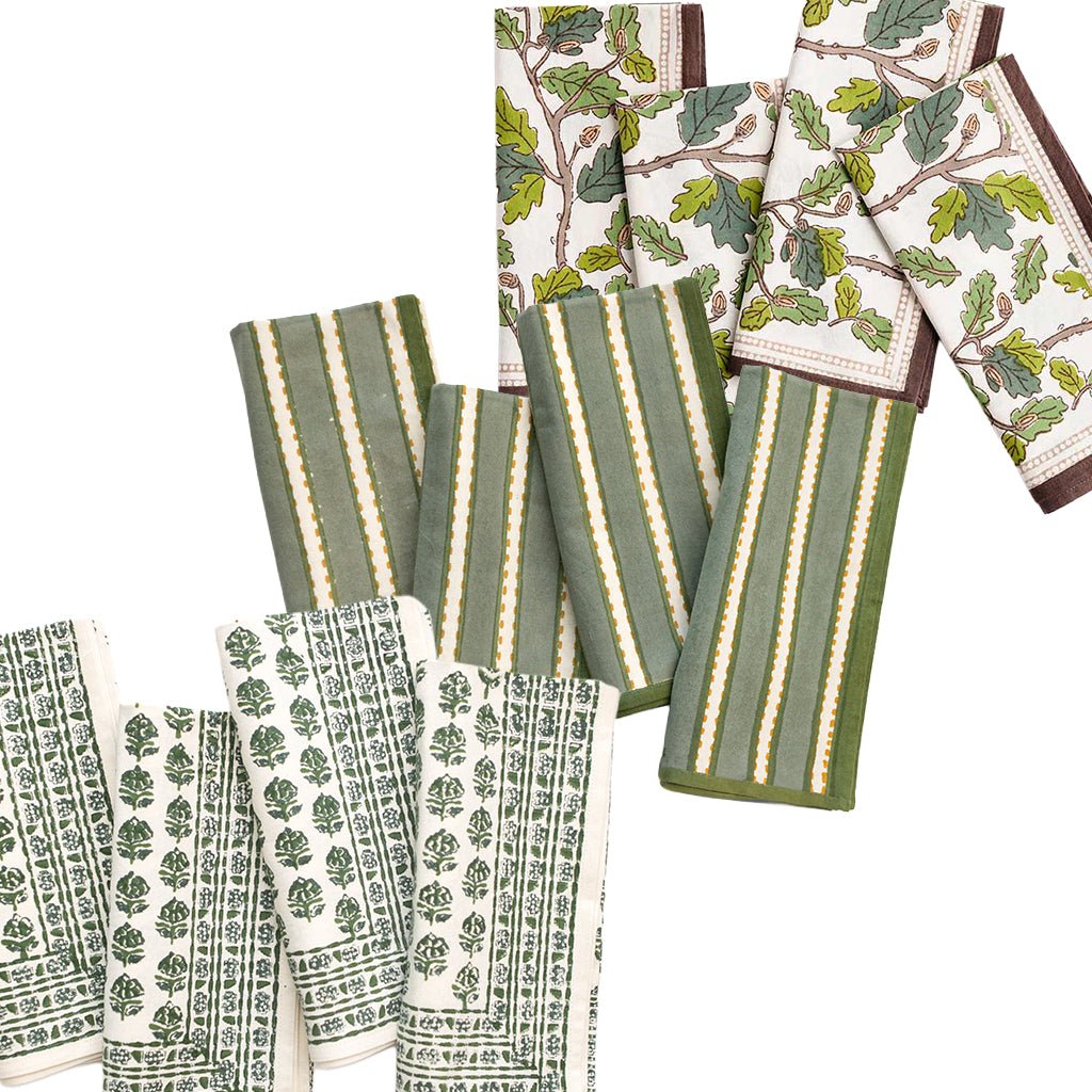 Celebrate the beauty of the season with our Gathering Greens Napkin Bundle, a curated trio of hand block printed designs that bring fresh, organic charm to the table. This set includes one napkin each in Elise Green, Maple and Acorn, and Dotted Green Stripe, all crafted by artisans in India using traditional carved wooden blocks. The hand printed process gives every motif depth, texture, and the subtle variations that make artisan linens so distinctive.