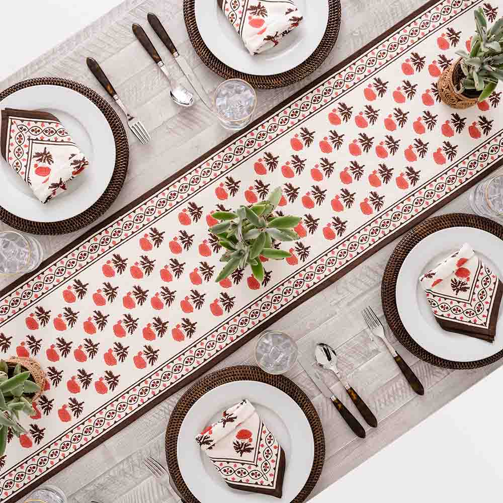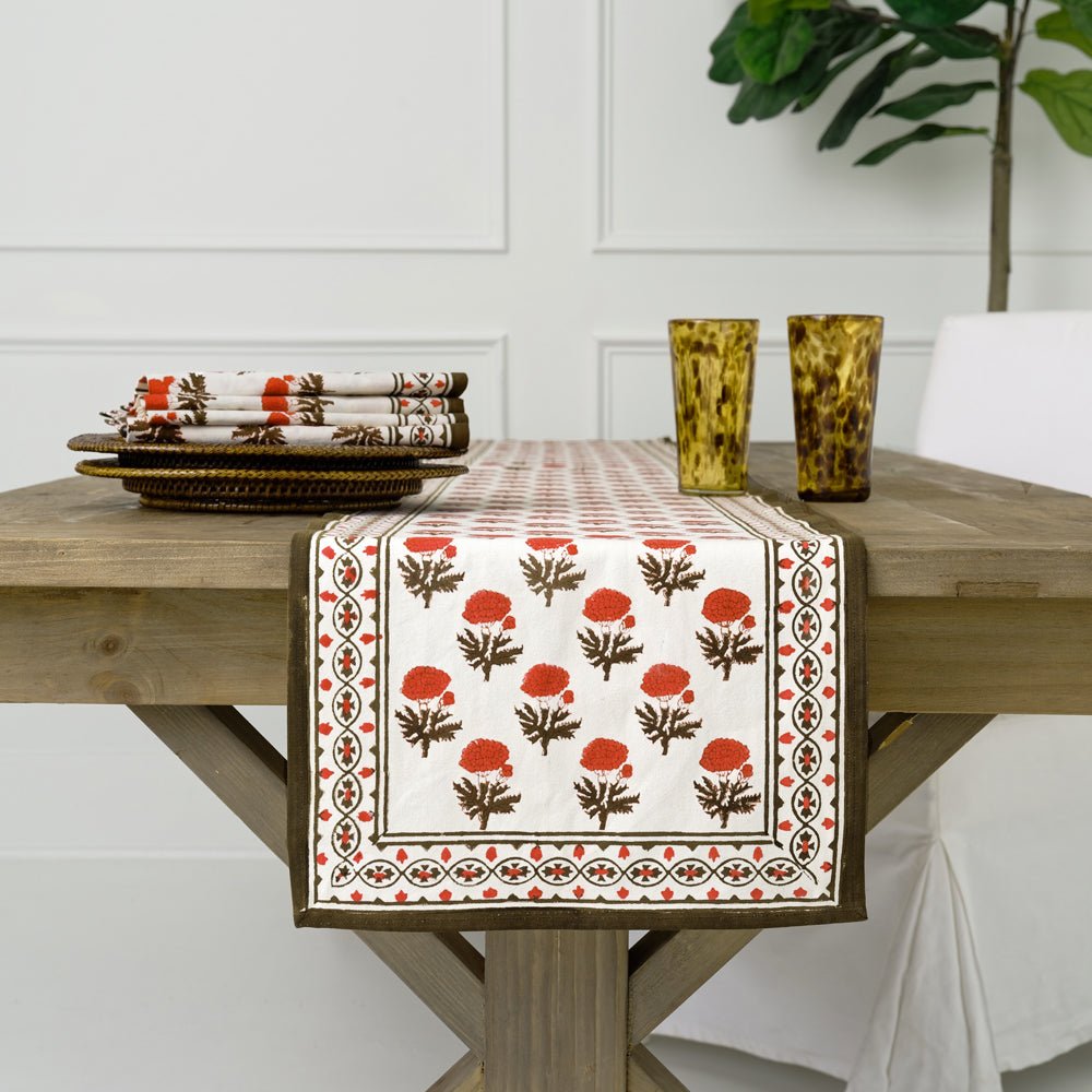 Named after an ancient and holy city in India, our Gaya Brown & Persimmon Table Runner captures the splendor, mystery and beauty of the Asian subcontinent. Printed by hand using rich dyes and carved wooden blocks to achieve a one-of a-kind design, this cotton Table Runner makes a striking display on your formal tabletop.
