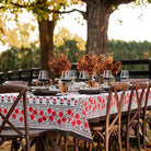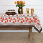 Named after an ancient and holy city in India, our Gaya Brown & Persimmon Tablecloth captures the splendor, mystery and beauty of the Asian subcontinent. Printed by hand using rich dyes and carved wooden blocks to achieve a one-of a-kind design, this cotton tablecloth makes a striking display on your formal tabletop.