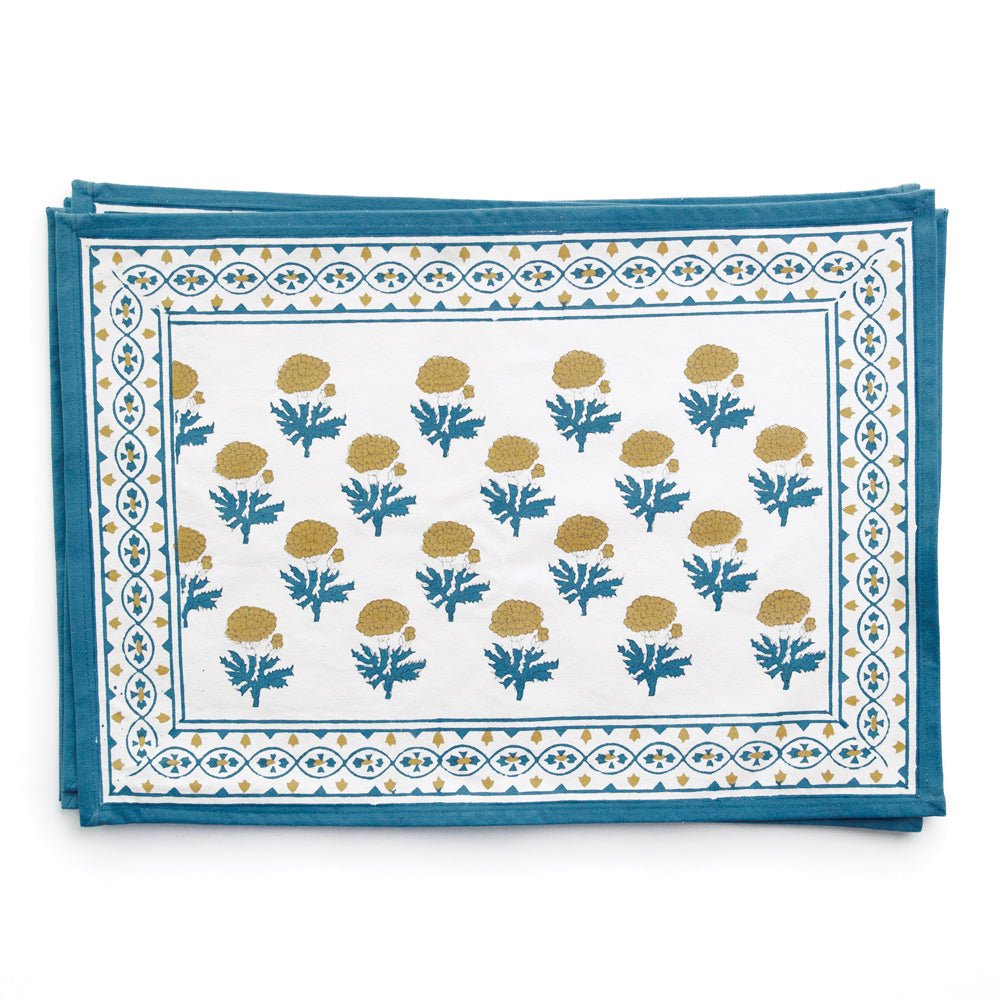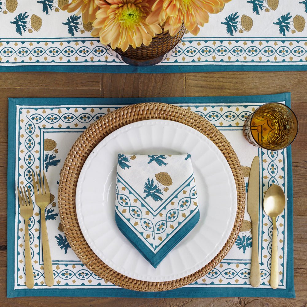 Named after an ancient and holy city in India, our Gaya Teal & Marigold placemat capture the splendor, mystery and beauty of the Asian subcontinent. Printed by hand using rich dyes and carved wooden blocks to achieve a one-of a-kind design, these cotton dinner napkins make a striking display on your formal tabletop.