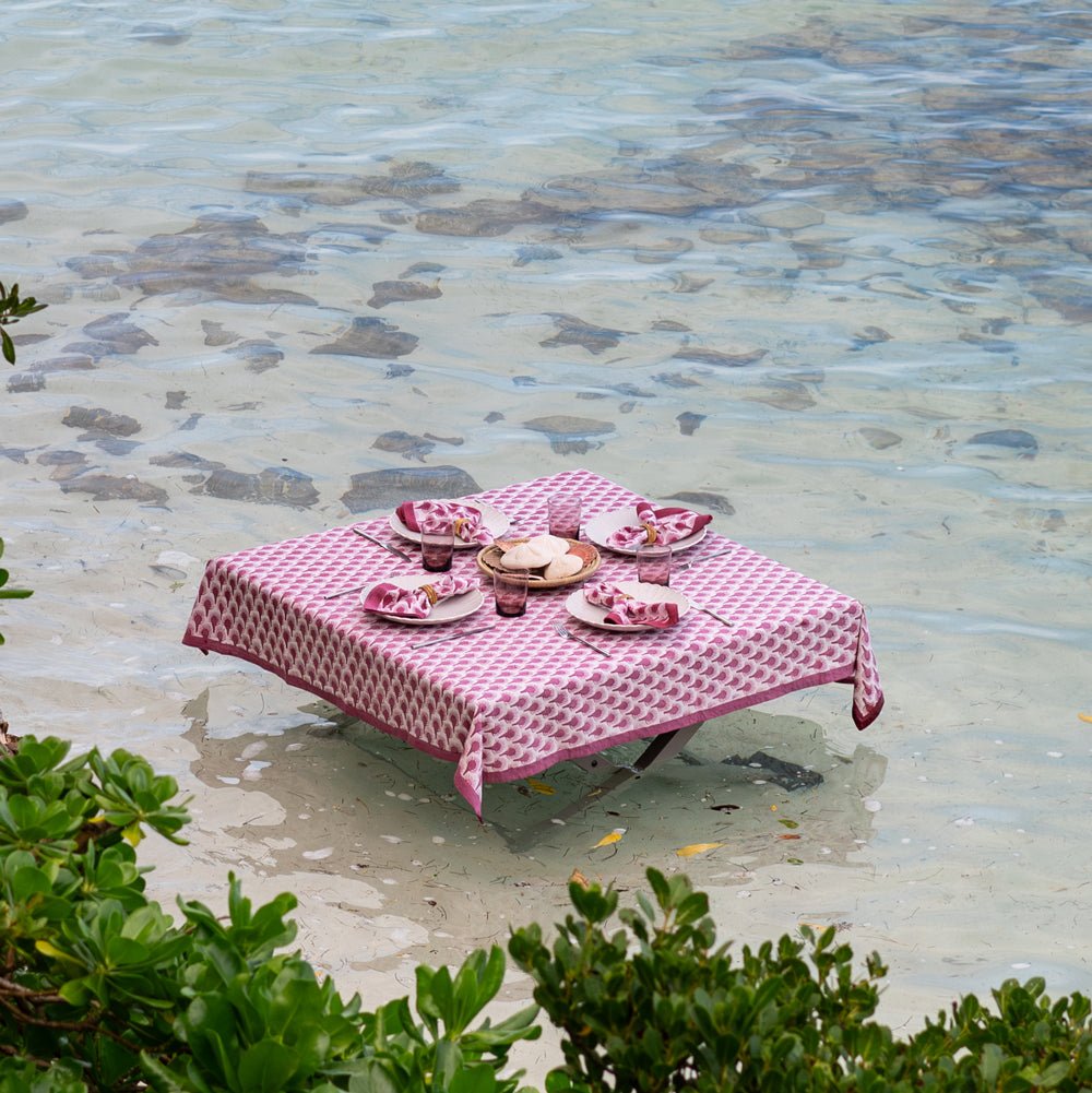 Add a pop of color and whimsy to your table with our Geo Feather Fuchsia Tablecloth. Hand block printed with a bohemian feather pattern in vibrant shades of pink, this tablecloth is sure to bring a playful touch to any gathering. Perfect for adding a unique touch to your dining experience.