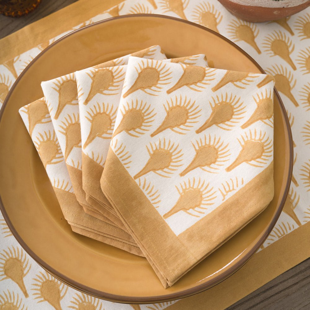 Liven up your table setting with our Geo Feather Ochre Napkin Set! Each napkin is hand block printed on soft cotton and features a bohemian inspired feather design in a vibrant ochre color. Set includes 4 napkins for all your entertaining needs. Let your table reflect your unique style!