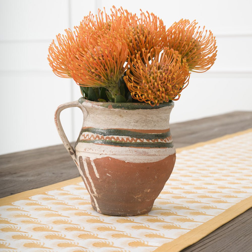 Add a touch of bohemian charm to your dining table with our Geo Feather Ochre Table Runner. Hand block printed with a playful feather design in a warm ochre color, this runner will elevate your dining experience. Perfect for adding a pop of unique style to any meal!