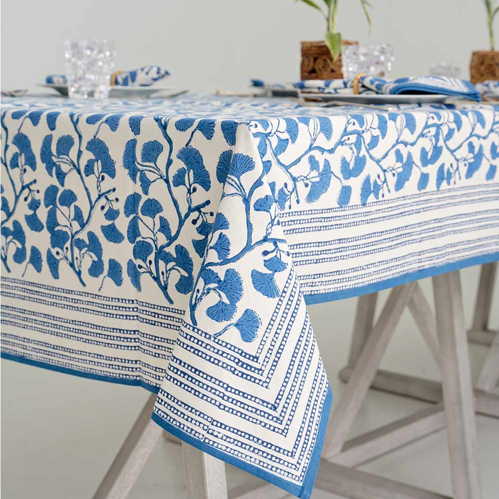 Fresh, breezy, and endlessly charming, our Ginkgo Blue Tablecloth is one of those pieces that instantly lifts the table, and the mood. Painterly ginkgo leaves scatter across a soft ivory ground in crisp, layered blues, creating a look that feels both tailored and relaxed. Classic, but not serious. Polished, but never precious. Very Pomegranate.