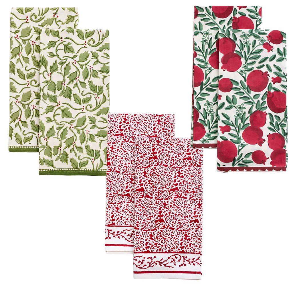 Bring festive charm to the heart of your home with our Holiday Tea Towel Bundle, a beautifully coordinated trio of hand block printed designs crafted by artisans in India. This set includes one tea towel each in Pomegranate Vine, Tapestry Deep Red, and Holly Berry, offering a collected mix of patterns that celebrates the artistry and warmth of the season. Each design is printed by hand using carved wooden blocks, creating layered texture, rich color, and the subtle variations that make every towel uniquely beautiful.