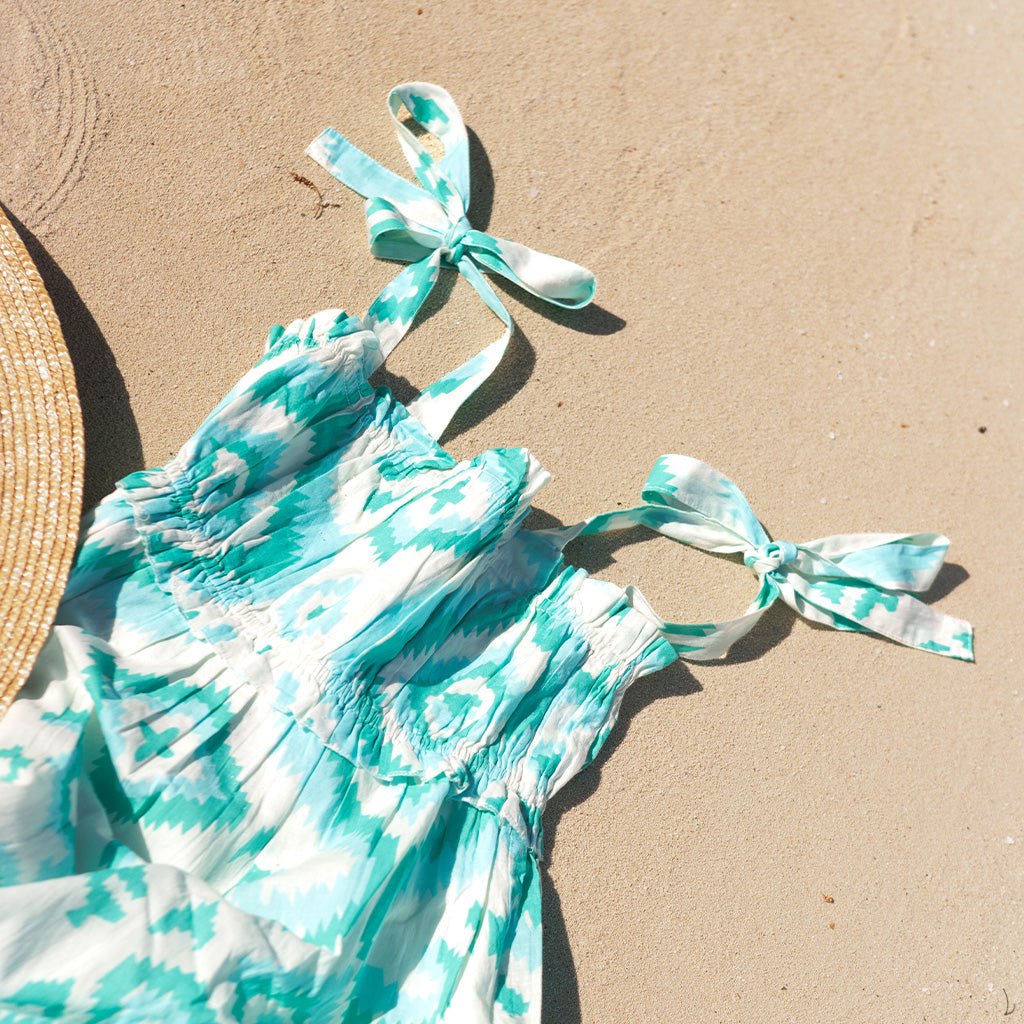 This strappy sleeveless dress captures the airy charm of Ikat Azul. The shape is breezy and effortless, perfect for sun filled days and quiet vacations. Light fabric makes it ideal for walking the beach or heading to lunch. A simple, artful dress with a relaxed coastal feel.
