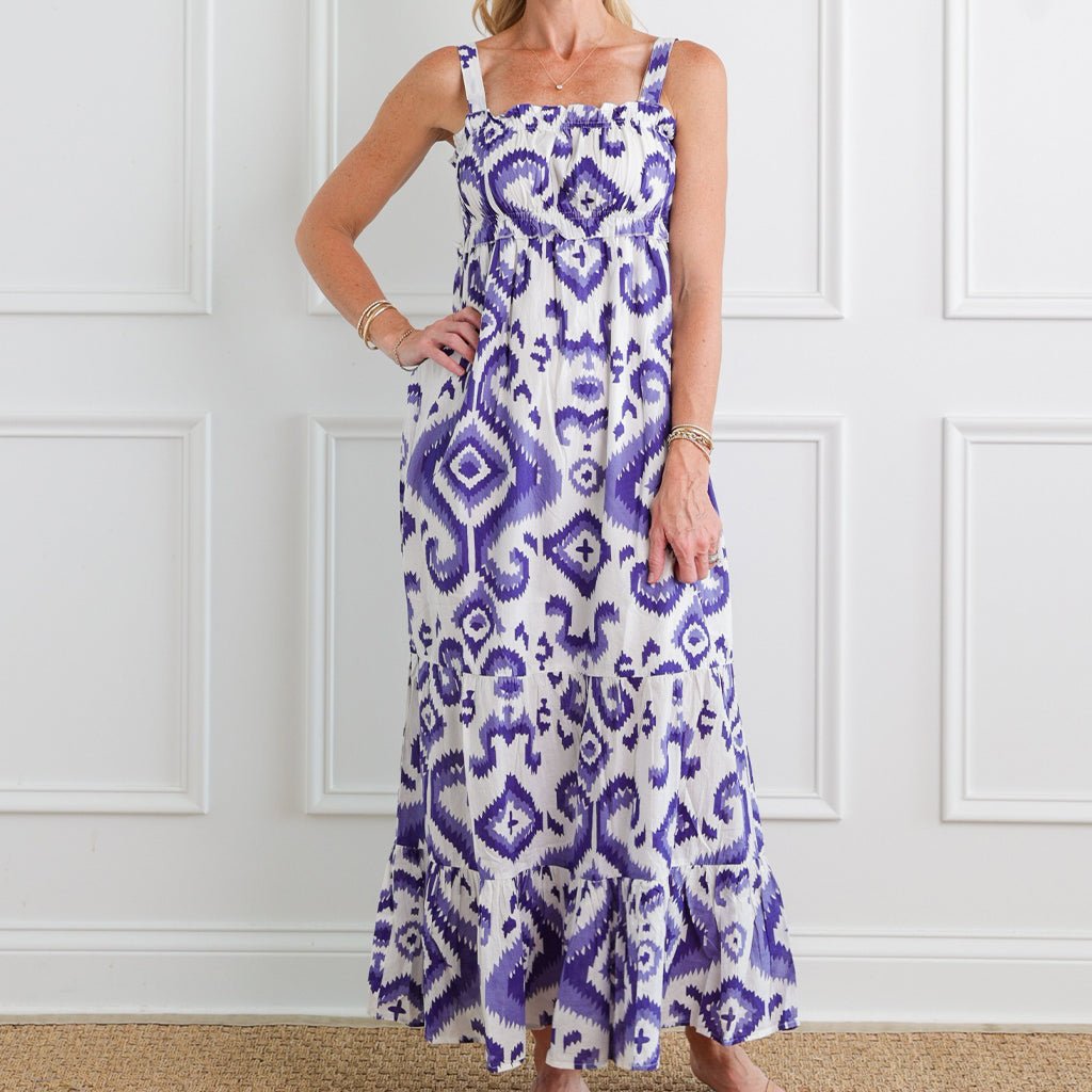 A warm weather favorite, this strappy sleeveless dress highlights the soft geometry of Ikat Very Peri. The shape is easy, breezy, and ready for sun filled days. Lightweight fabric makes it simple to dress up or down. A lovely balance of artful print and understated charm.