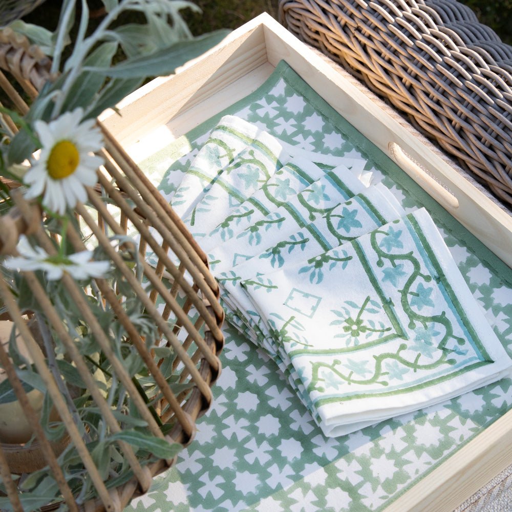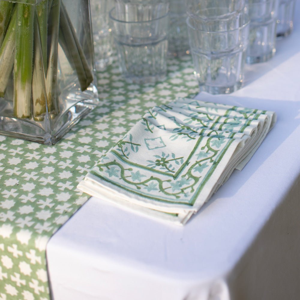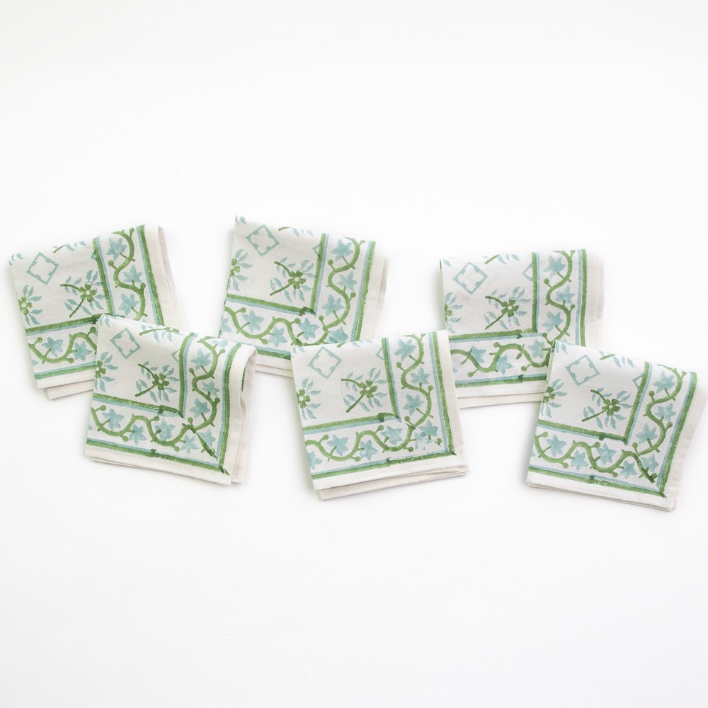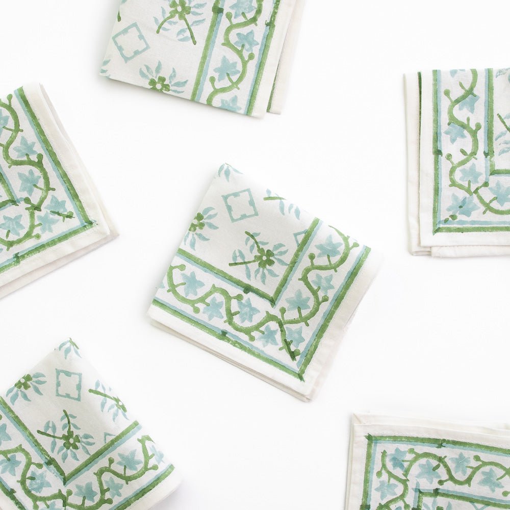The delicate floral pattern from these tiles, now hand block printed in soothing Palladian Blue and Soft Sage, adorns these cocktail napkins. Ideal for both casual and formal gatherings, adding a touch of elegance to any setting.