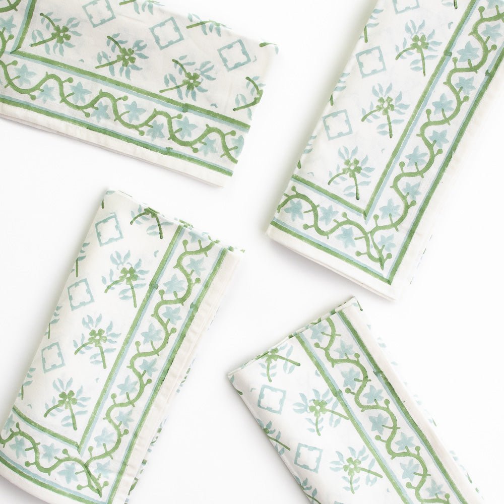The delicate floral pattern from these tiles, now hand block printed in soothing Palladian Blue and Soft Sage, adorns these napkins. Ideal for both casual and formal gatherings, adding a touch of elegance to any setting.