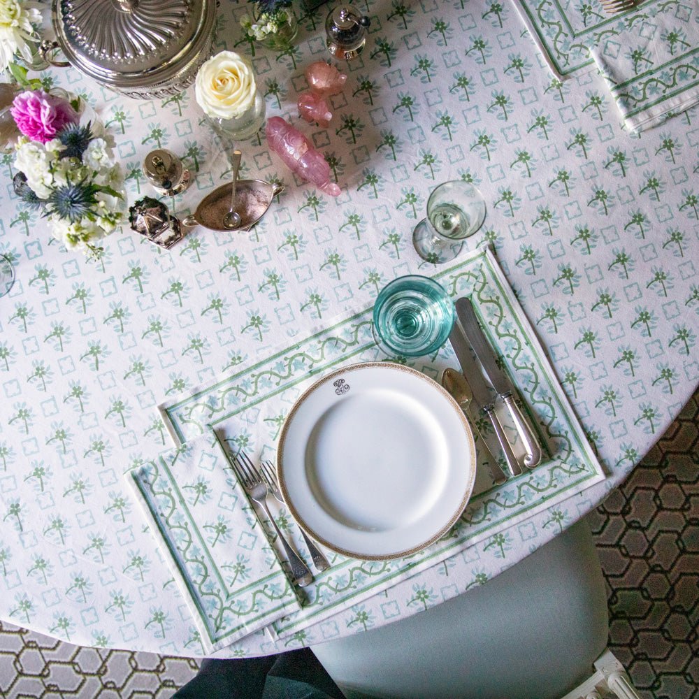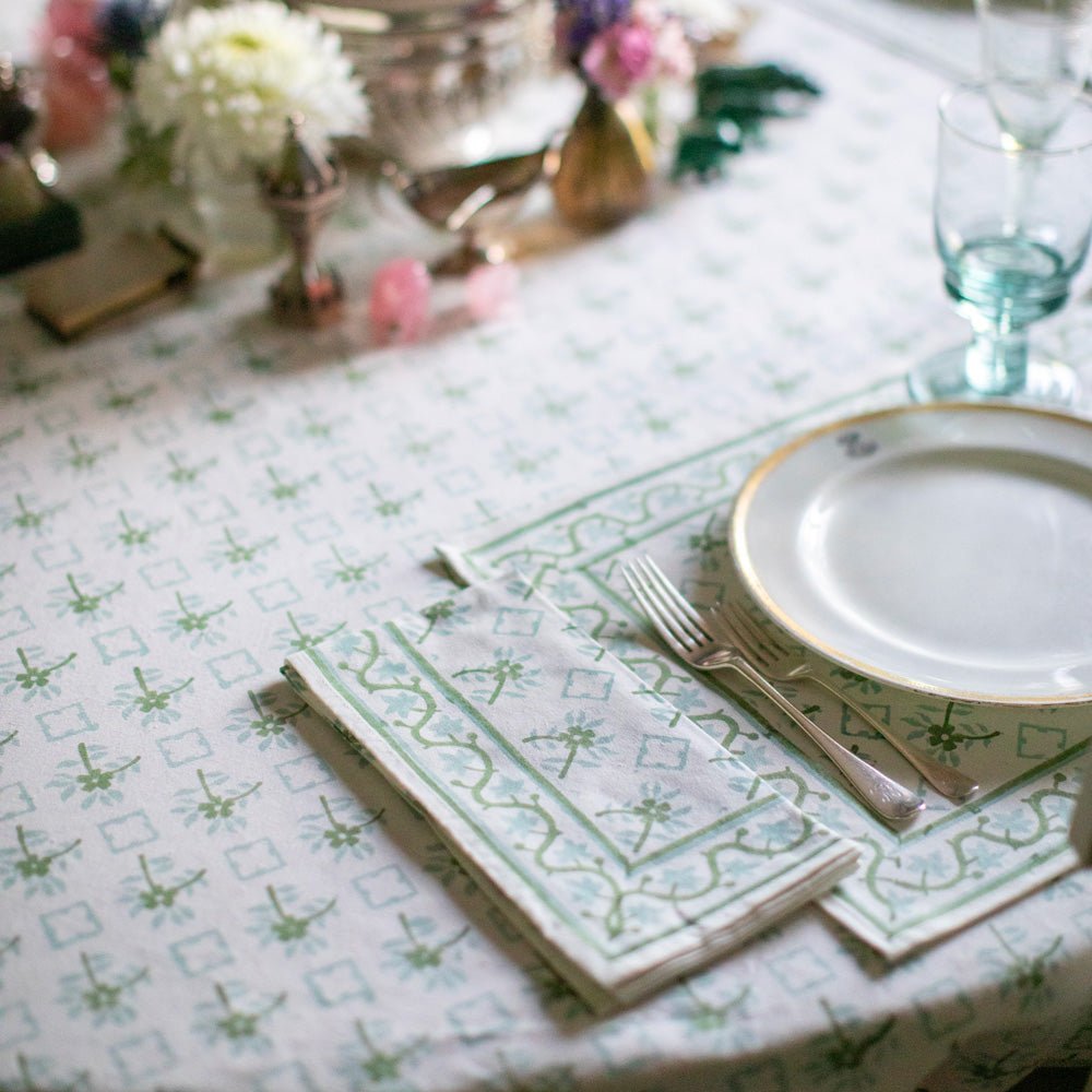 The delicate floral pattern from these tiles, now hand block printed in soothing Palladian Blue and Soft Sage, adorns this tablecloth. Ideal for both casual and formal gatherings, adding a touch of elegance to any setting.