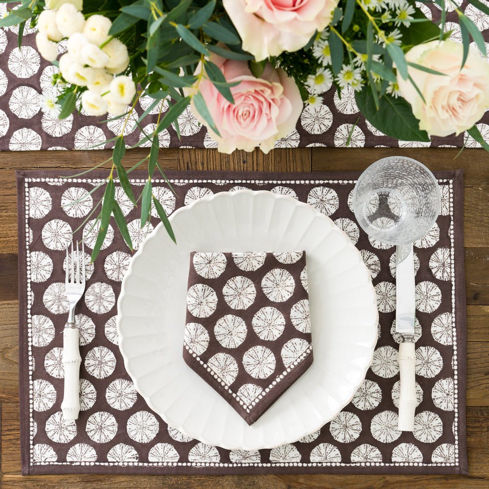 The Love Story table linen collection is made to mix and match, pair your favorite placemat and napkin patterns in rich chocolate brown and soft blush and bring your tablescape to life. Explore this beautiful table linen collection by India Hicks Home.