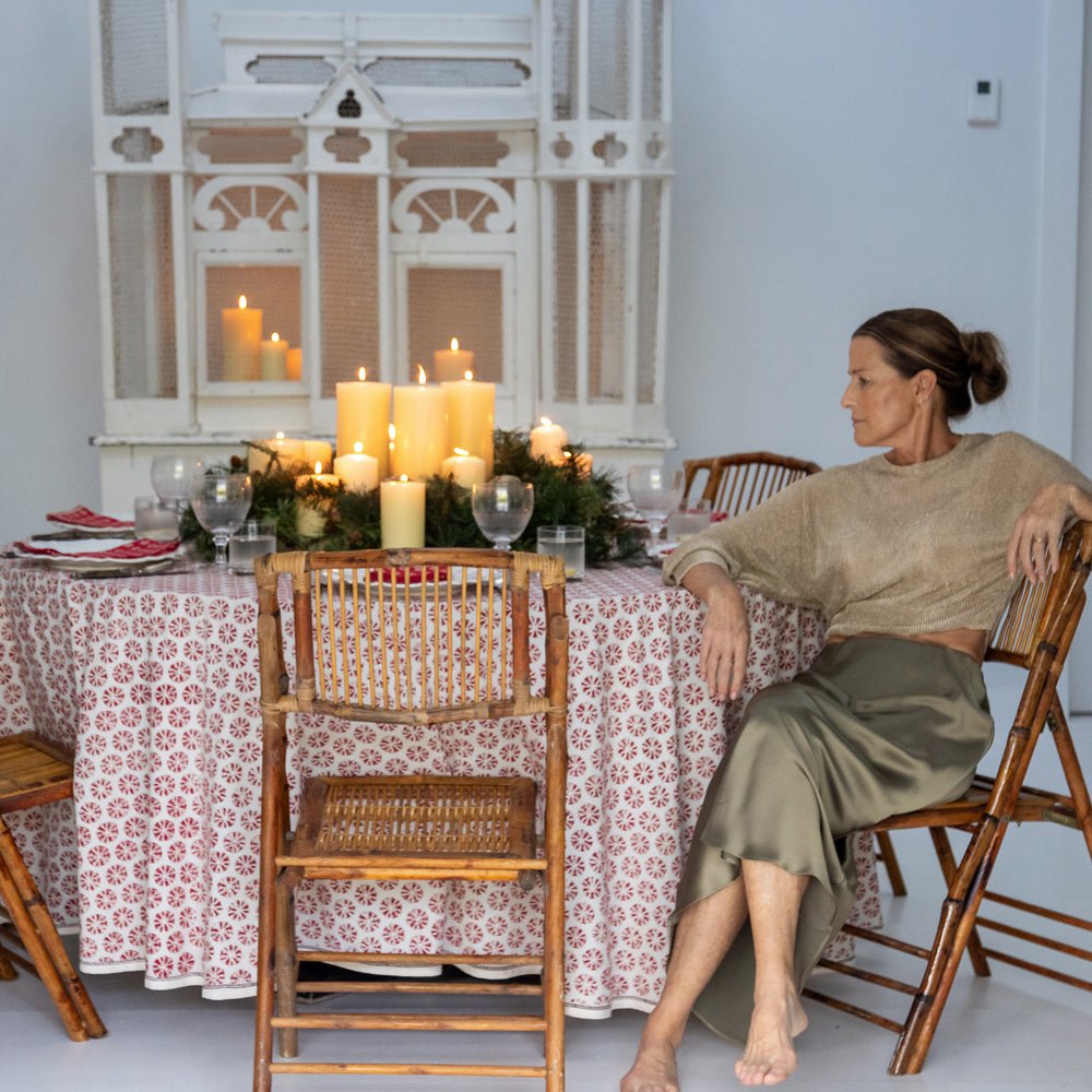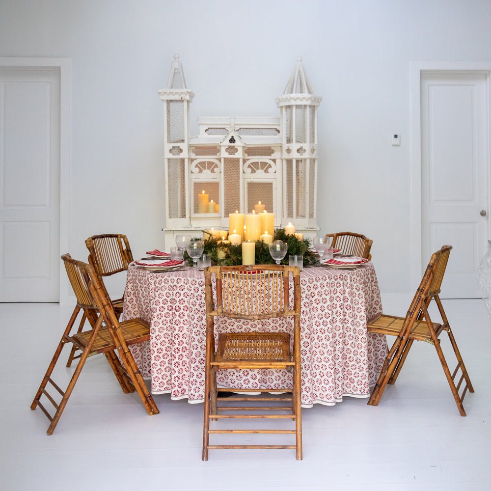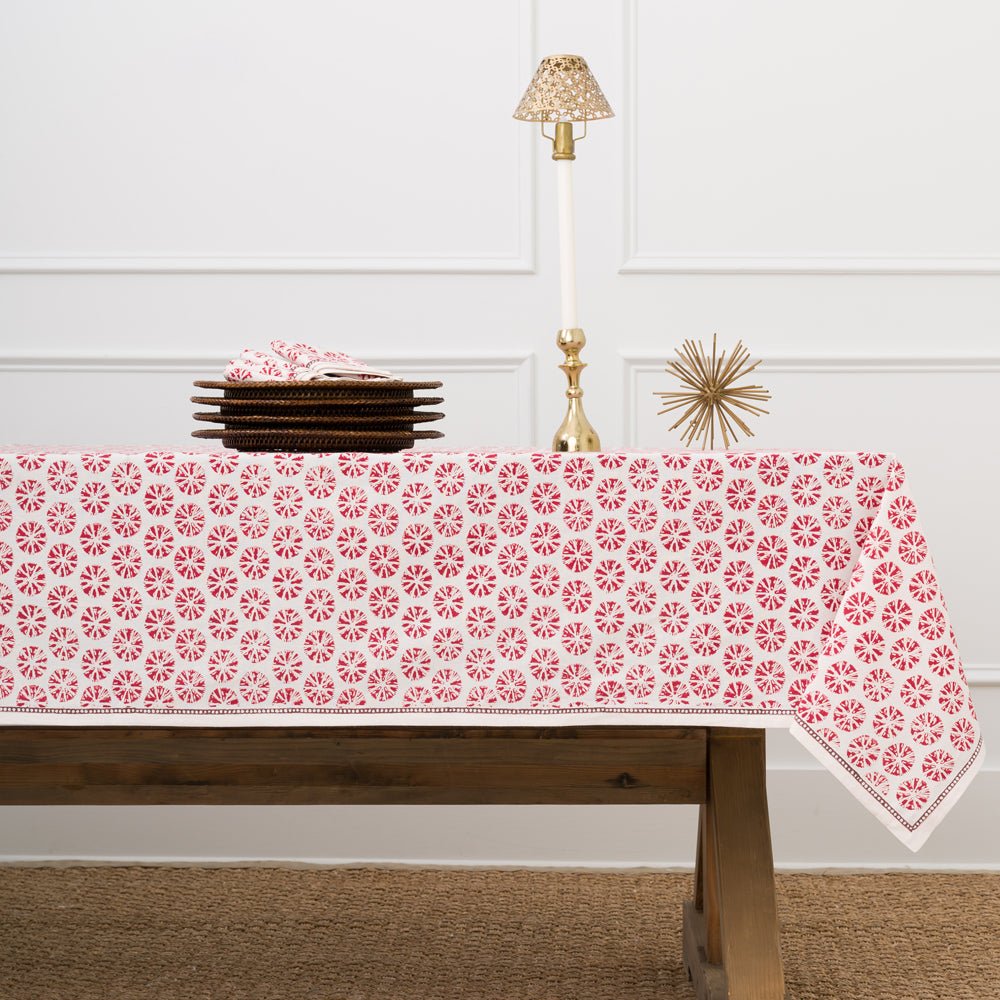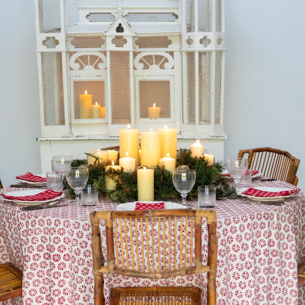 | 55 x 55 | We call this our card table size; perfect to add a pop of pattern and color on a small square table that seats 4 people or as a topper on a basic round table. |