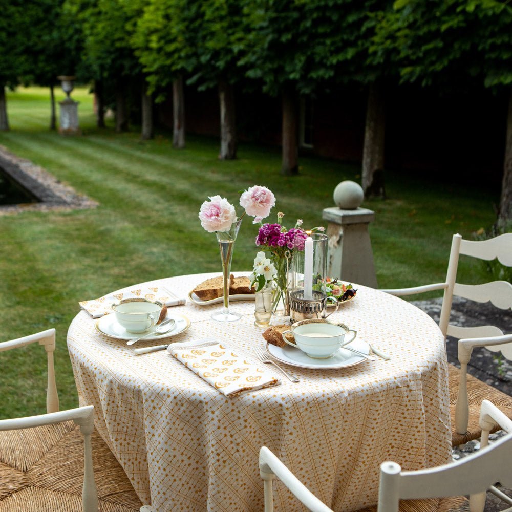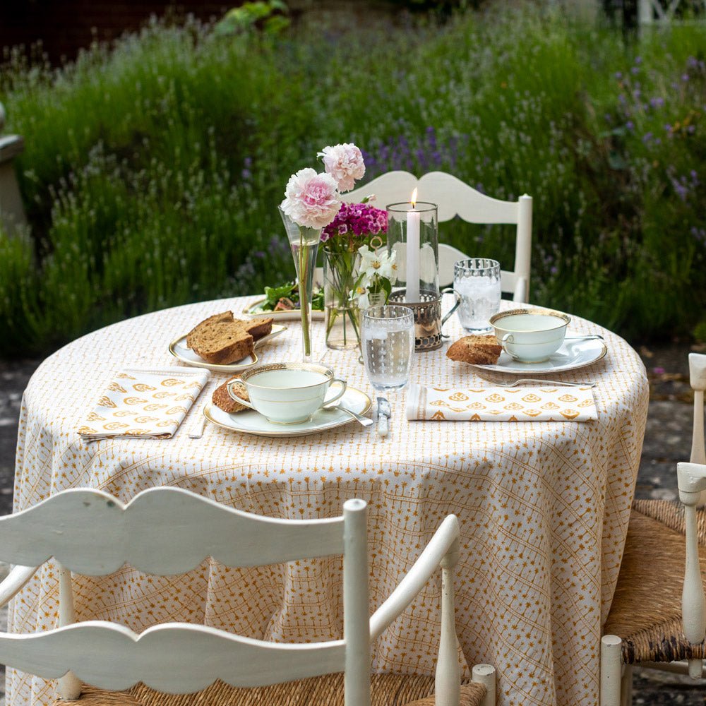 This beautiful 100% cotton, hand blocked printed Tablecloth in Palm Avenue Golden is intended to be mixed haphazardly together with the other patterns, just as our families are.