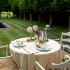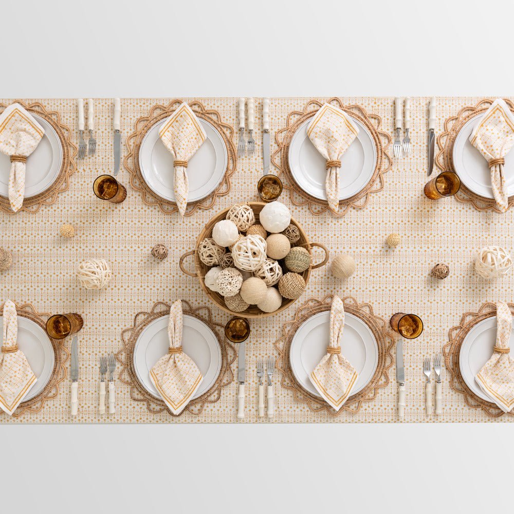 We seized the power of color and pattern to fill our Endless Summer Collection with optimism and joy. Our Palm Avenue Golden Tablecloth is inspired by the GOLDEN sunshine of a Bahamas summer day, and patterns borrowed from the reassuring avenue of palm trees that have stood proud in our garden.